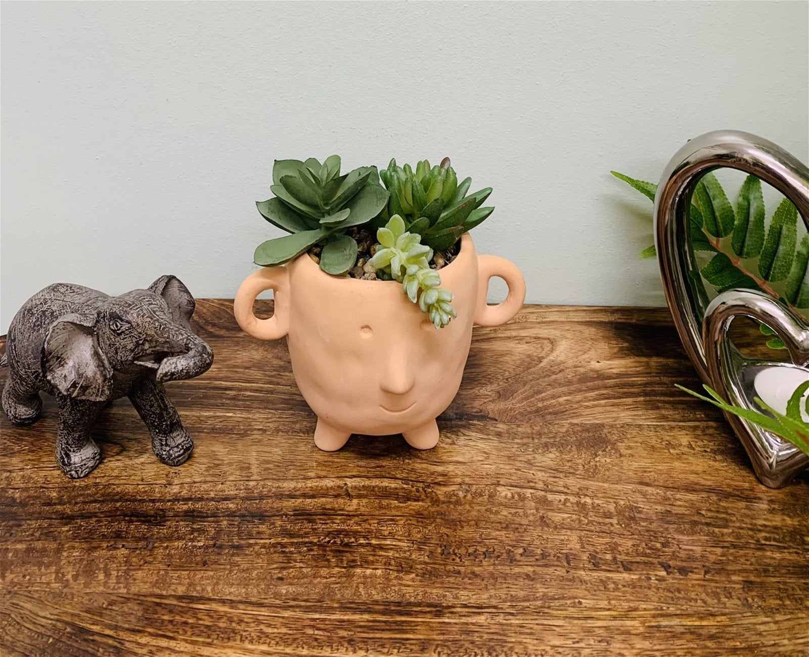 This quirky handmade terracotta pot with face detail and ear handles contains four faux cacti plants. Comes adorned with an artificial succulent plant and gravel bedding. Measurements: D14 x H14 x W12cm SKU: OR1605