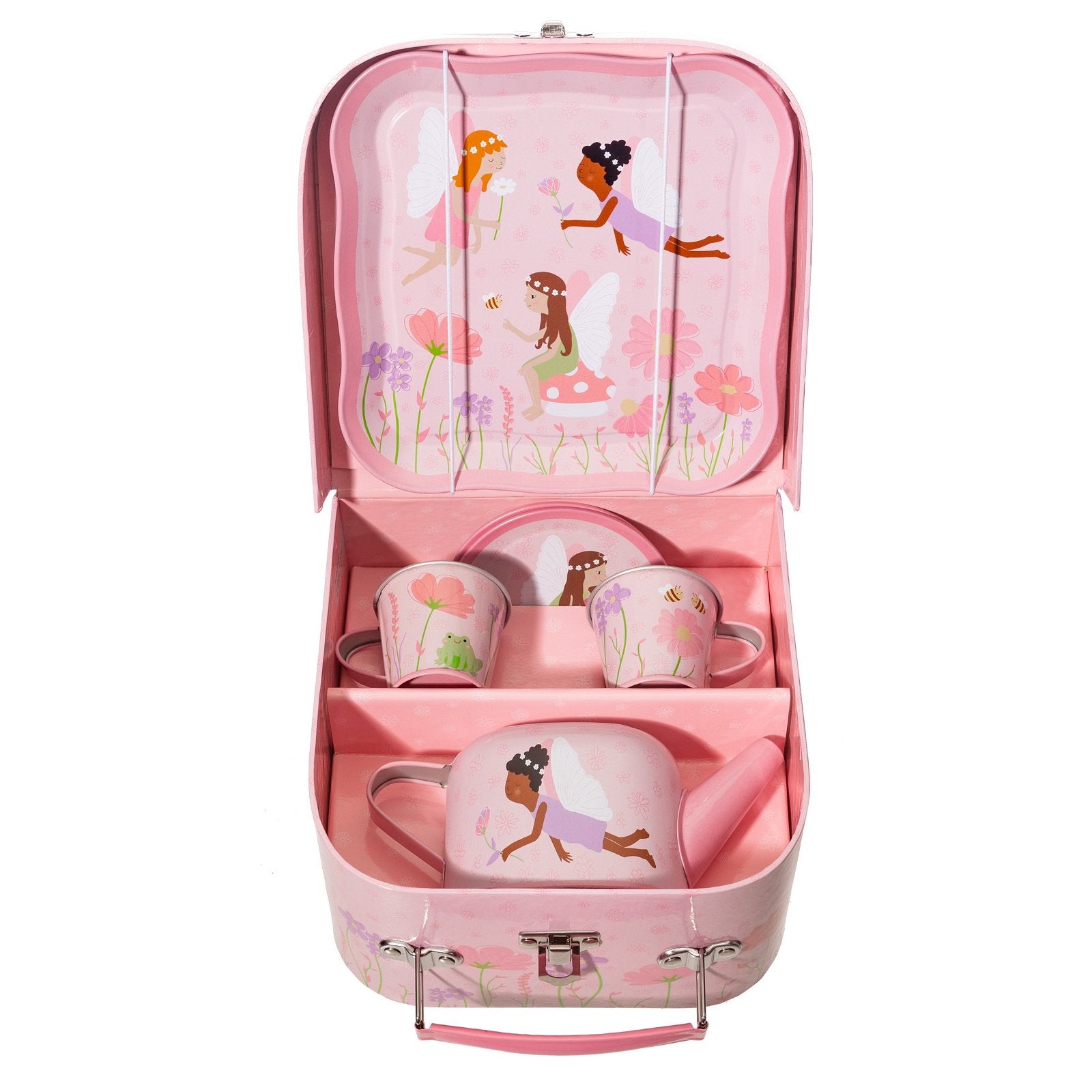 This set includes one tray, one teapot, two plates and two teacups. Crafted from tin and finished with a dreamy fairy design, featuring a colourway of soft pastels. This item is an imitation toy set and not suitable for hot or cold drinks. This item is not suitable for children under 36 months old due to small parts which may cause a choking hazard. Measurements: D17.5 x H9.5 x W17.5cm