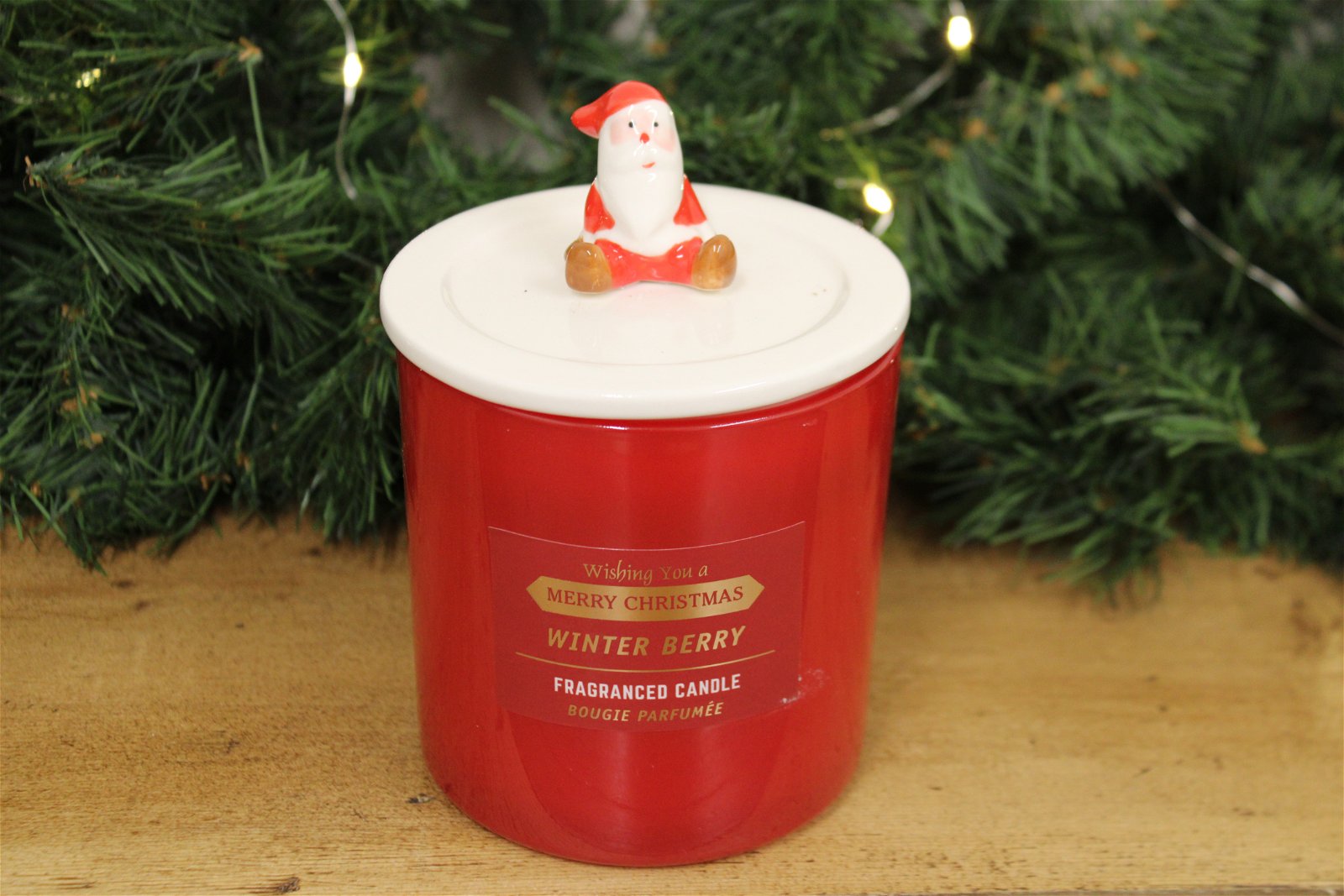 Red glass candle pot with ceramic Father Christmas lid. Fragranced with Apple and Cinnamon. Perfect gift idea. Measurements: D10 x H10 x W10cm