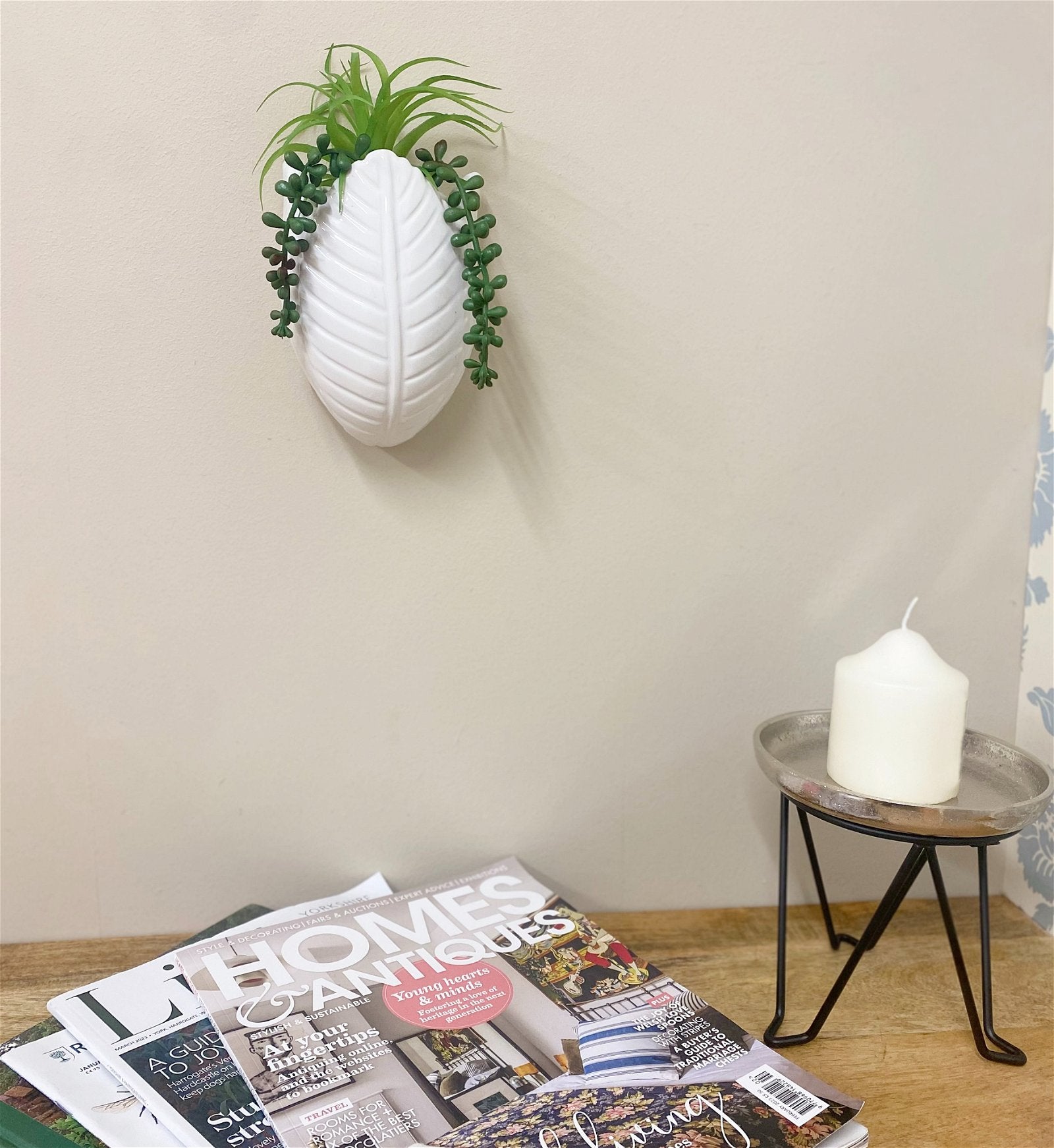 Wall mounted white planter with faux succulents. Made from high-quality ceramic, in a gloss finish with leaf texture. Ready to affix, with pre-drilled wall mounting hole. Measurements: D8 x H21 x W11.5cm