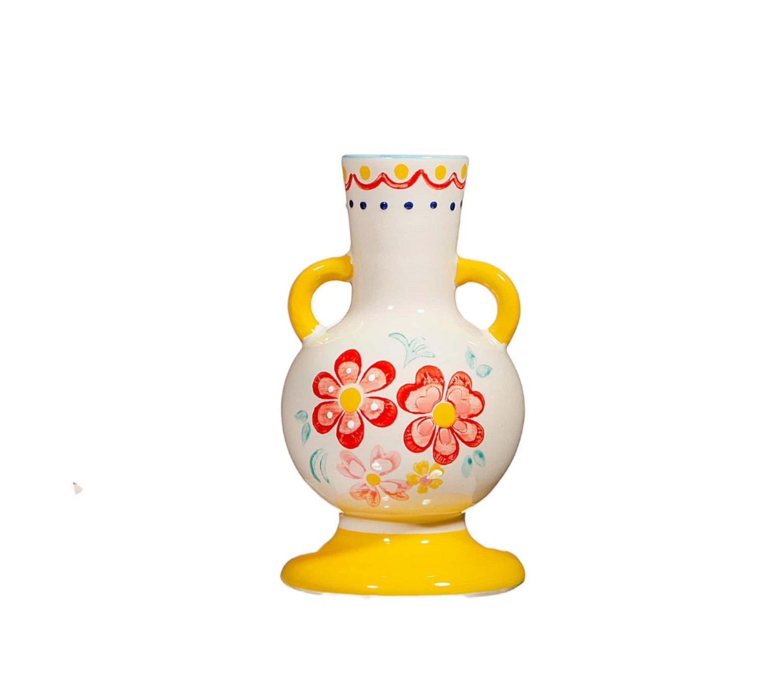 Designed for inside the home, perfect for displaying small bunches of fresh or dried flowers. Random pick of three different bud vase shapes. Featuring a floral pattern in a colourway of yellows, blues and reds. Each vase is hand finished and made from Kaolin. The vases are sold individually and are dispatched at random. Individual measurements: Red: L: 6.5cm W: 8cm H:12.5cm Blue: L: 7cm W: 7cm H:13cm Yellow: L: 5cm W: 7cm H:12cm Measurements: D7 x H13 x W7cm