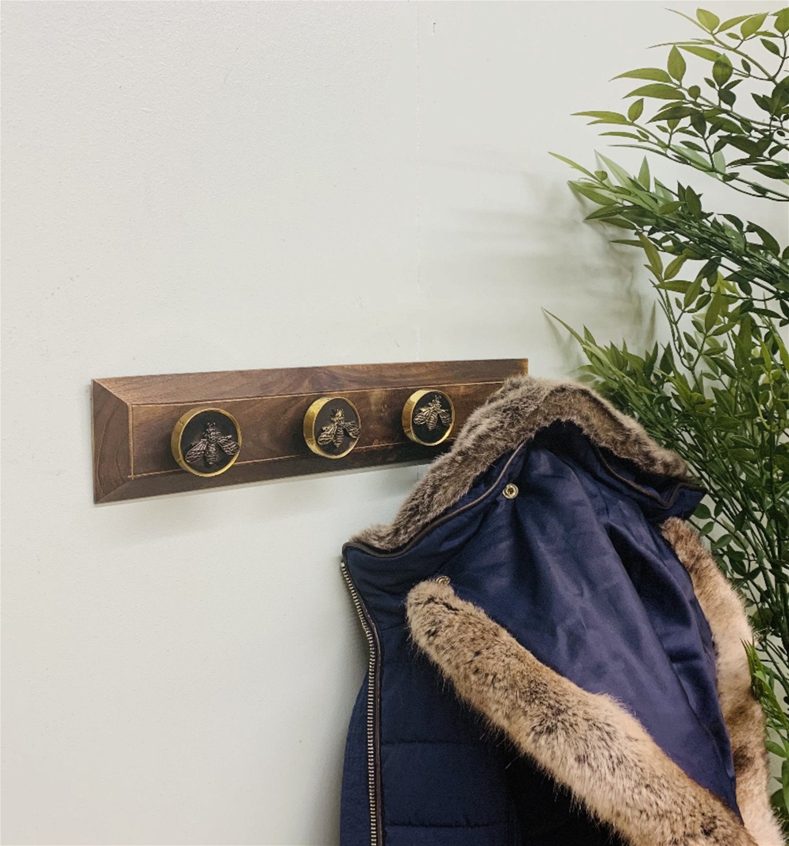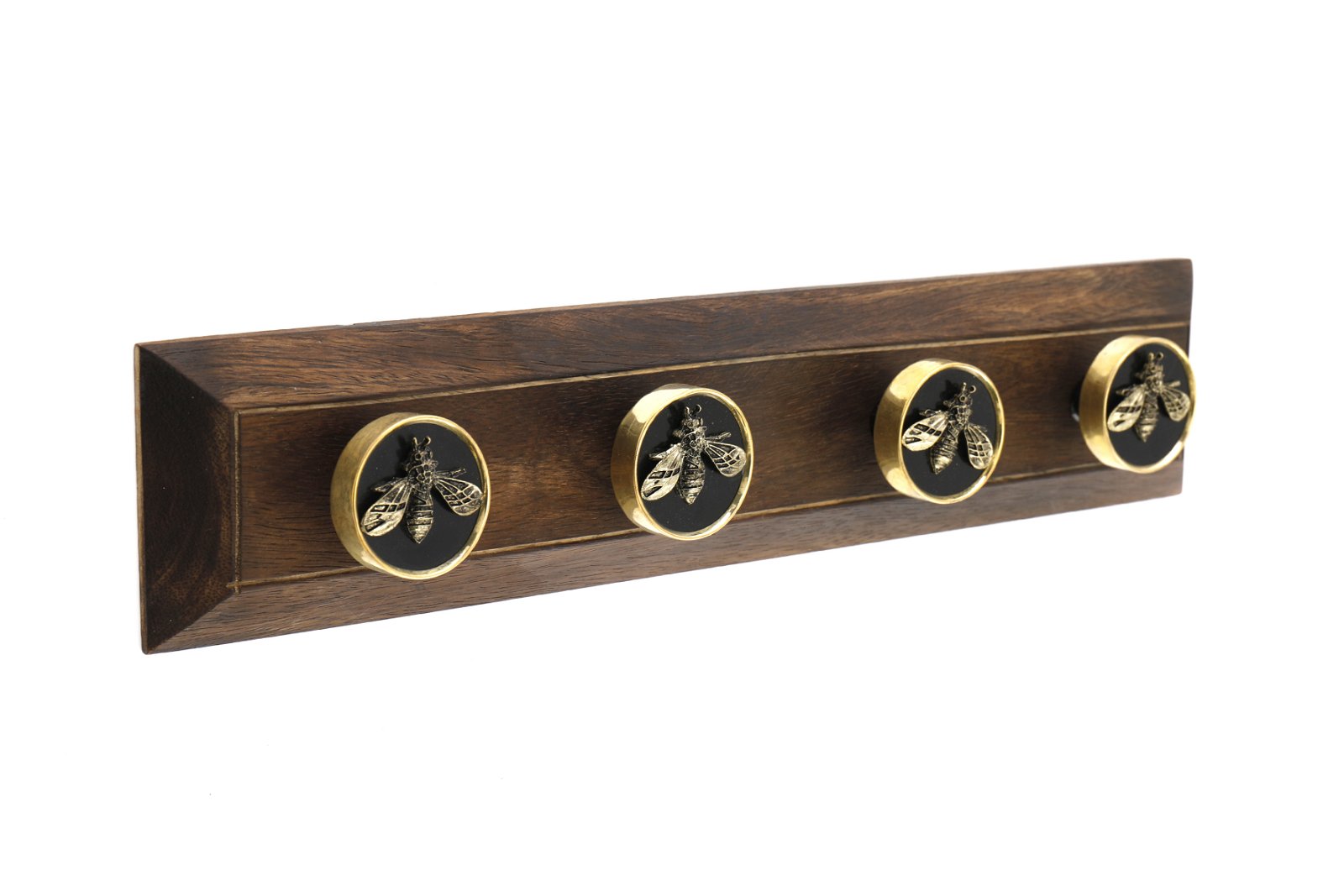 This wooden board has four gold circular knobs with intricately crafted bees sitting proud, a very attractive piece. The wooden base is 38.5x7.7x1.7cm with 4 black and gold Bee embossed coat knobs 5cm apart. The overall measurements are: D7.7 x H5 x W38.5cm SKU: TJBE06