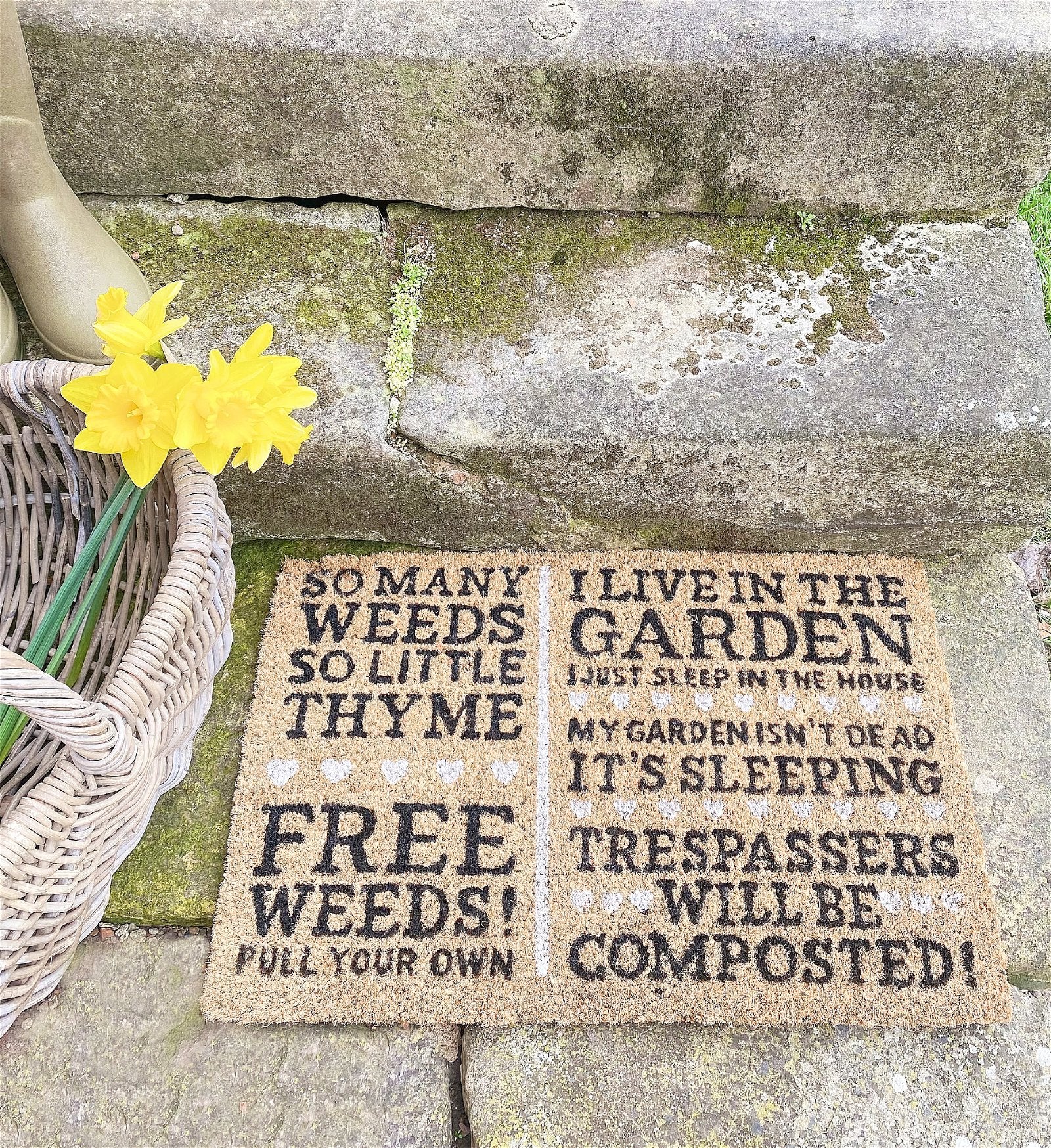 Add character to the entrance to your garden with the garden themed door mats. The door mat reads 'So many weeds so little thyme' 'Free weeds! Pull your own' 'I live in the garden I just sleep in the house' 'My garden isn't dead it's just sleeping' 'Trespassers will be composted!'. Made from coir which is a strong, hard-wearing fibre which is ideal for doormats. The bottom of the mat is made from PVC which is flexible but tough and ensures that dirt is trapped in the mat itself. Measurements: D1.5 x H40 x W60cm
