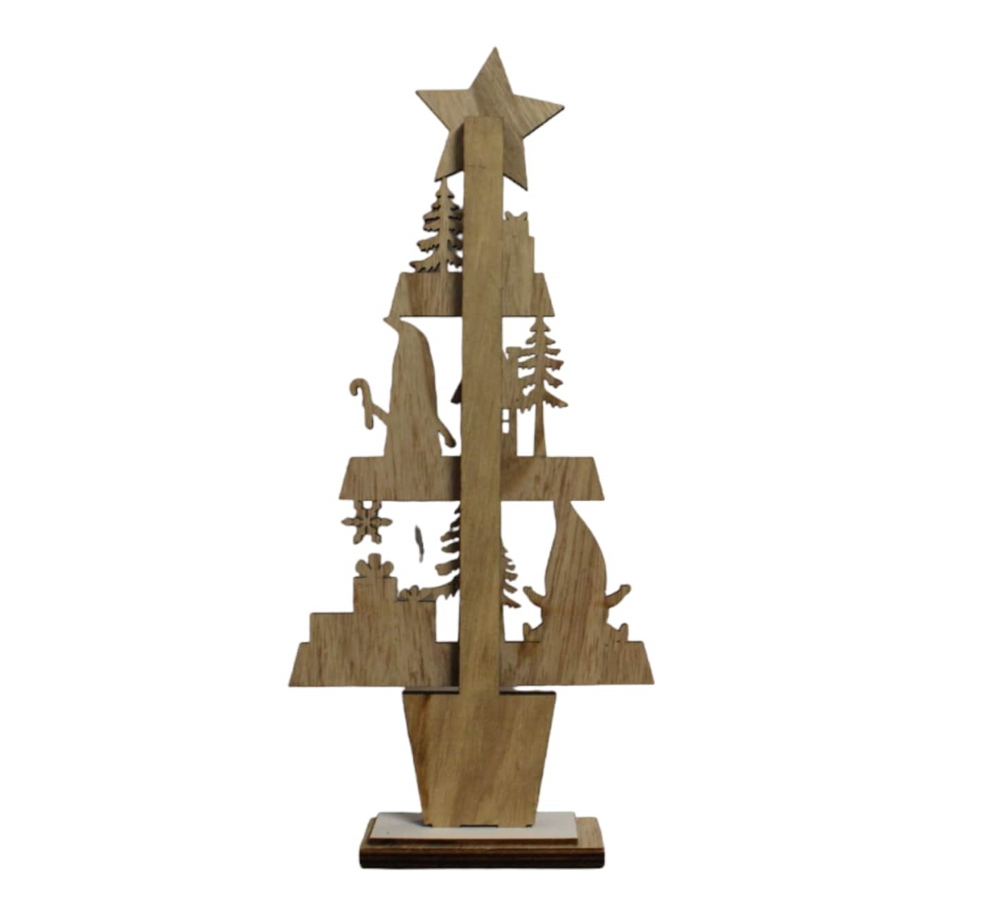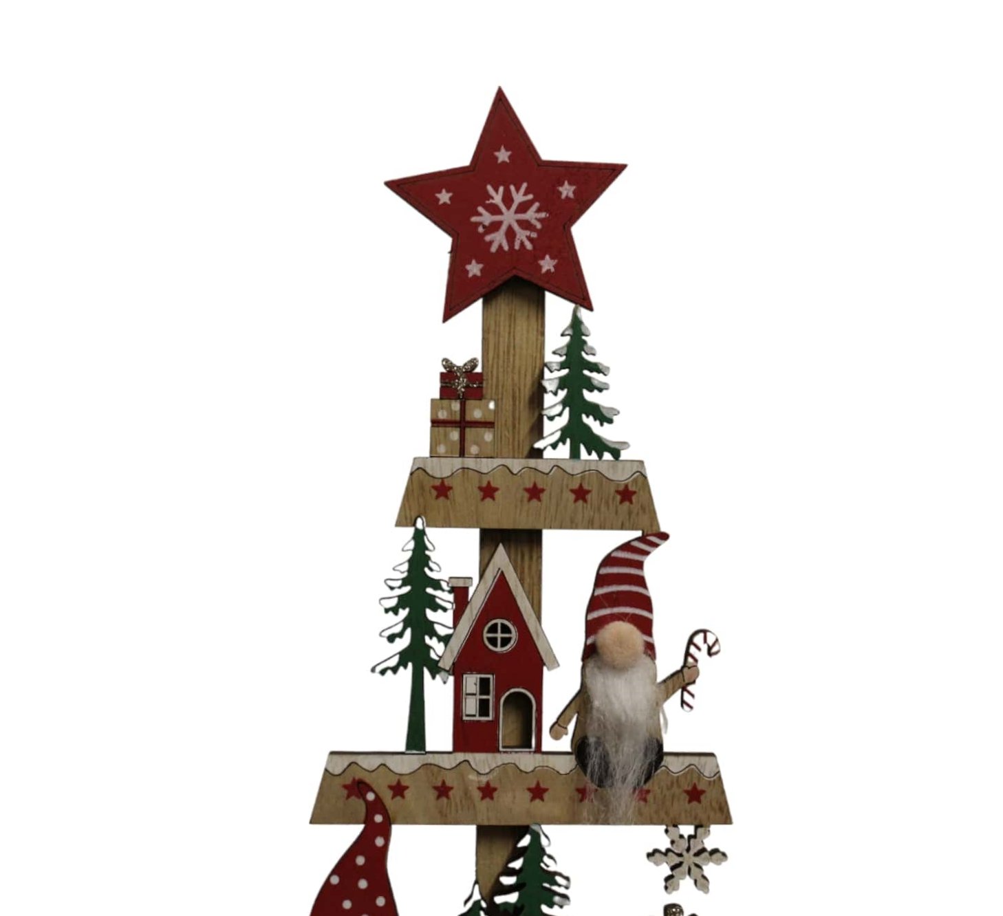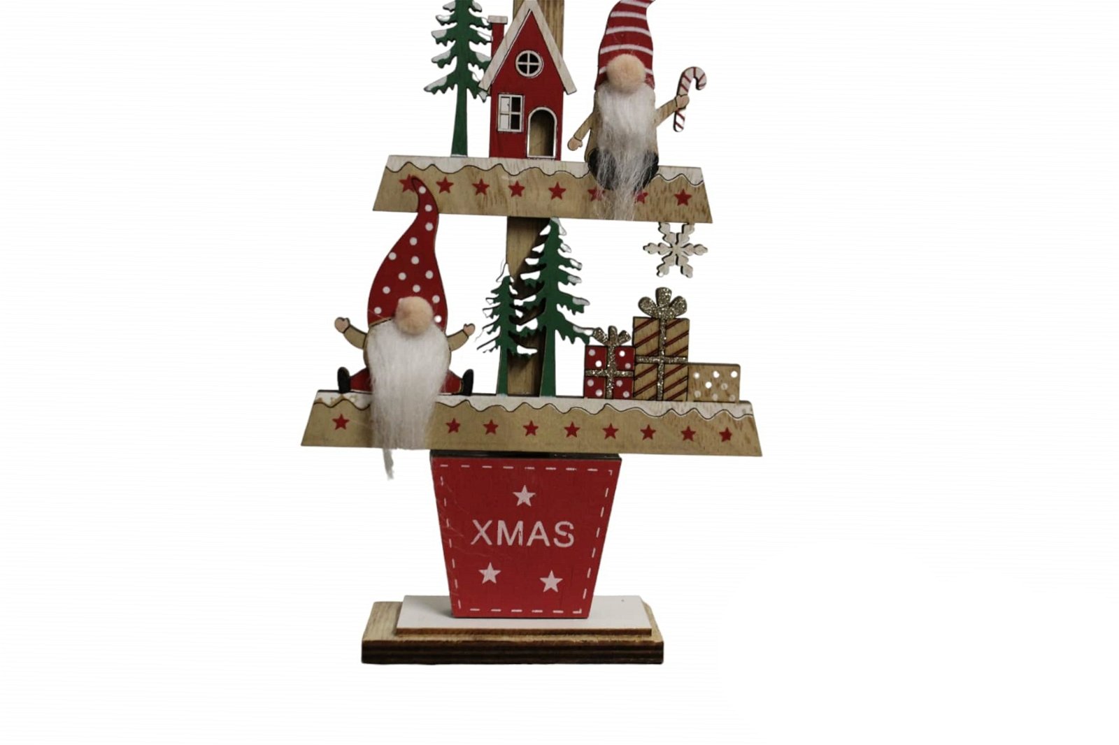 A free-standing wooden Christmas tree on base. Intricately detailed with two sitting Gonks. Perfect for a mantel piece or windowsill. Measurements: D5 x H29.5 x W13cm