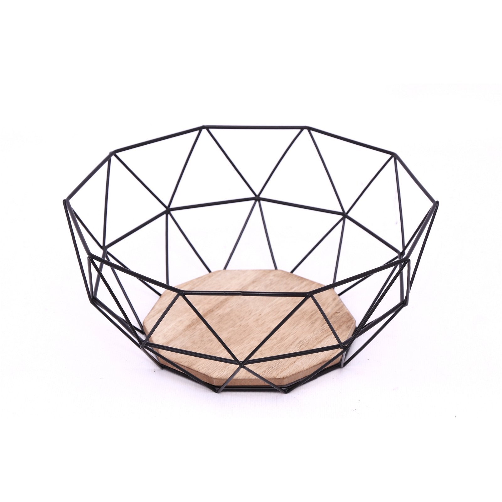 A bowl that utilises a geometric wire theme to give a unique look to the design. The bowl can be used to store a variety of items of varying sizes. The bowl itself is made out of black metal with the base being made out of a wood effect robust MDF. The base diameter is 15.2cm. Overall the measurements are: D26 x H12 x W26cm