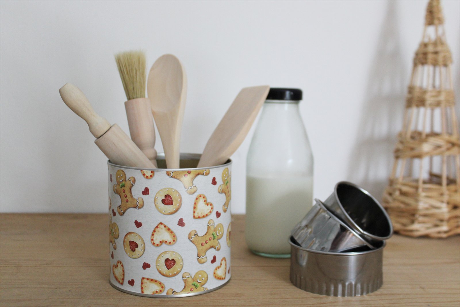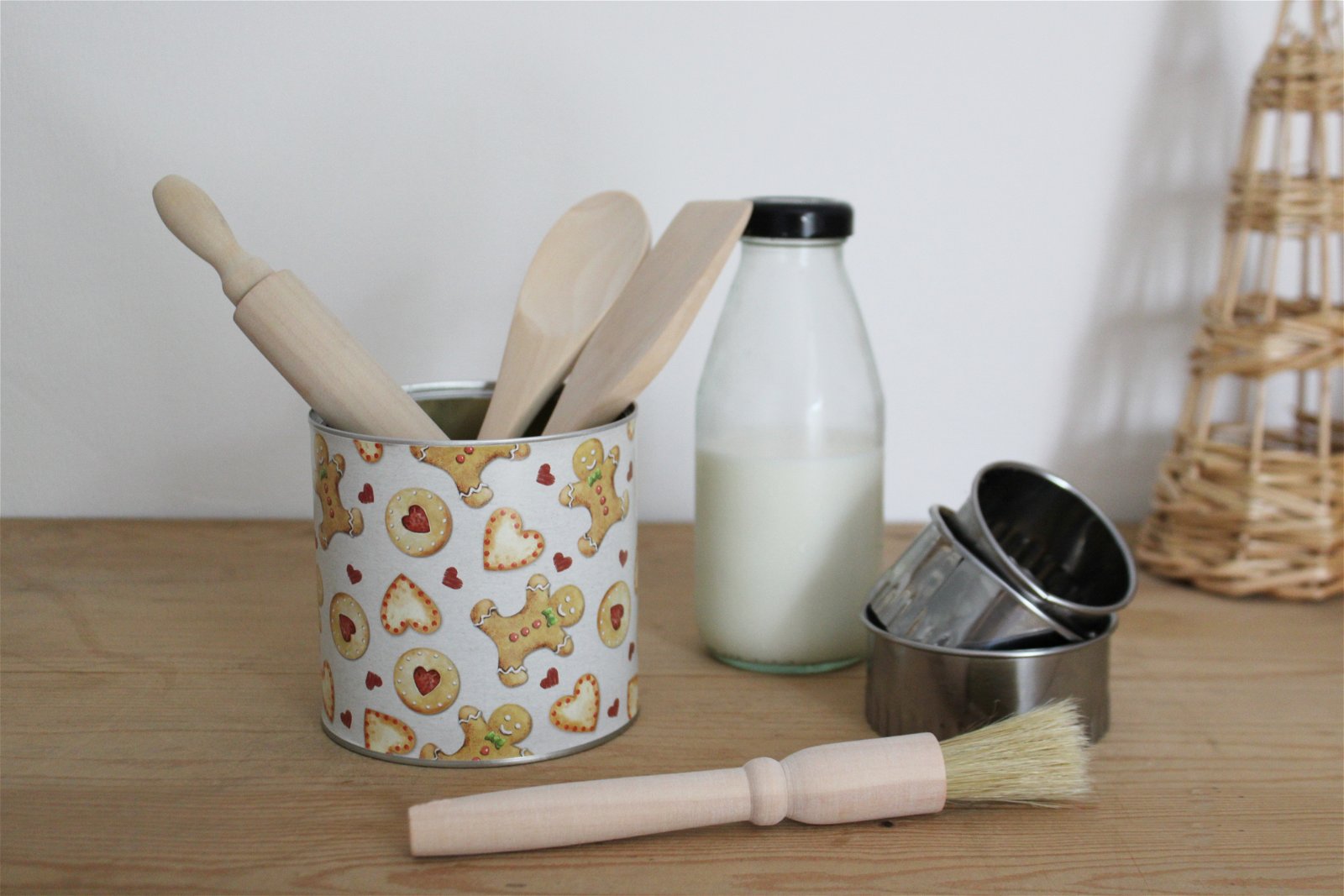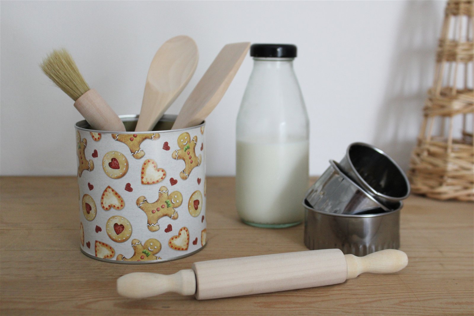 Junior baking utensil set in gingerbread tin. Five piece set including tin holder, mini rolling pin, mini pastry brush, mini spoon and mini spatula. Wooden utensils made from 100% Beechwood. Perfect gift idea. Measurements: D10 x H20 x W10cm
