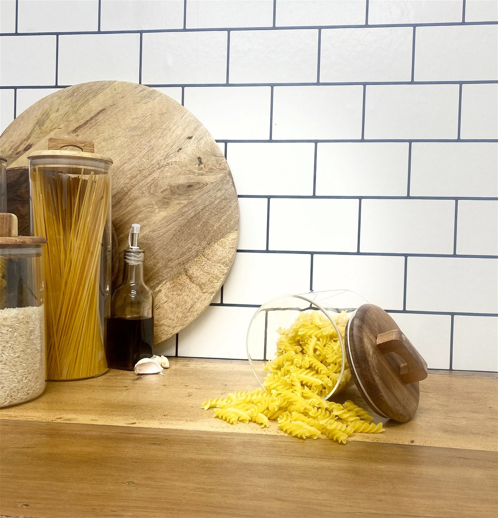 Bring charm and interest to your shelves, with this storage jar made from glass. Featuring an Acacia wood lid with an airtight sealer. Not only as we all try to reduce our plastic use, these stylish yet practical pieces are perfect for keeping grains and pulses fresh. This jar holds up to 1.1 litres. Measurements: D12 x H15 x W12cm