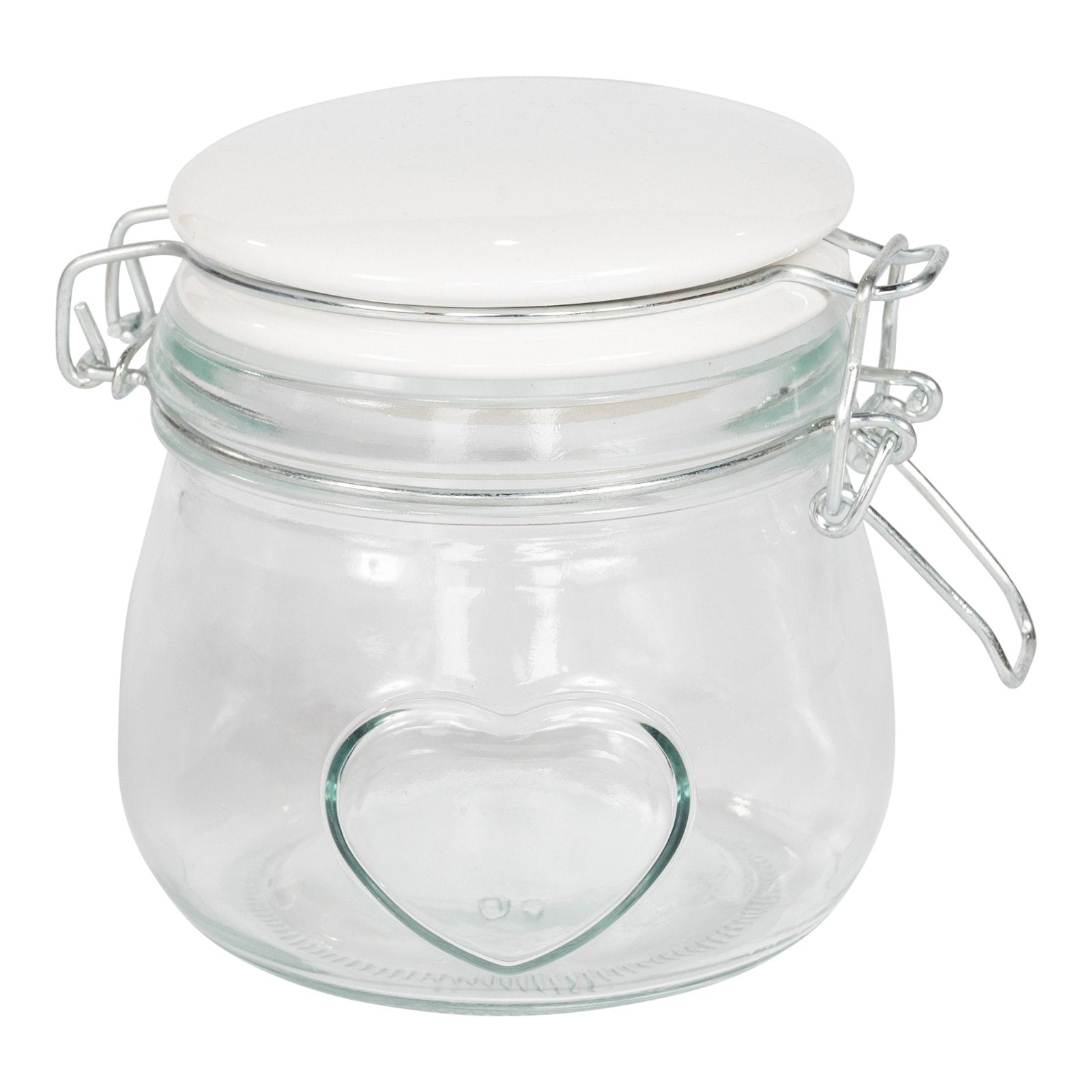 This glass storage jar with heart decal would be a perfect addition to any kitchen or pantry. The jar is 12cm tall with a white ceramic top and wire fitting in a Kilner style, with an approx volume of 945ml. Measurements: D12 x H12 x W15cm SKU: KI6427A