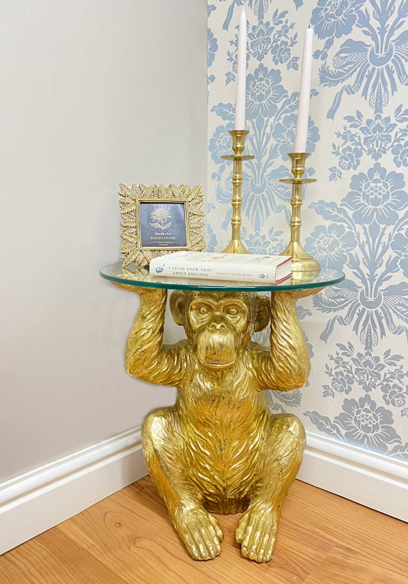 This comical monkey is sculpted of resin and finished in gold. He is in a sitting position supporting a glass top with the hands. The reinforced glass top is 0.75cm thick with a smoothed edge and is secured with a central screw into the top of the monkey. The maximum width of the monkey is 38cm. Measurements: D45 x H50 x W45cm