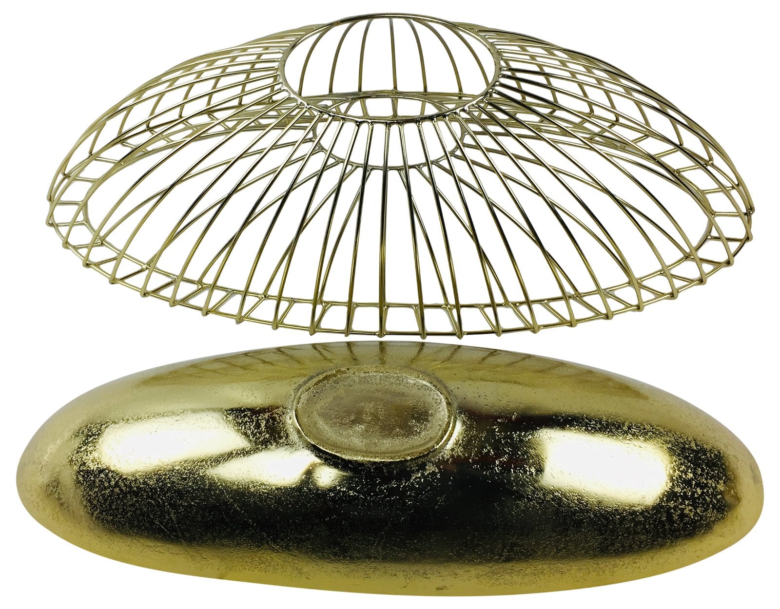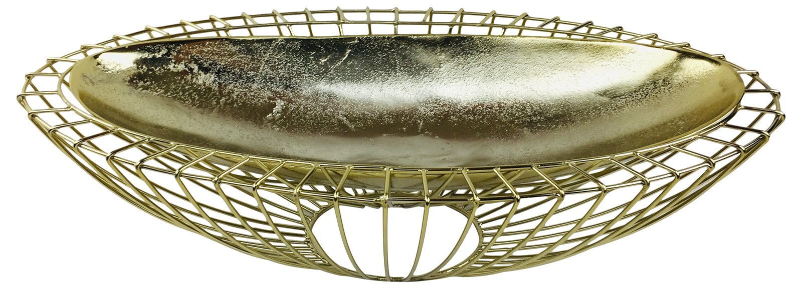 A stylish bowl with a simple wire design and gold painted finish that can be used for decorative purposes or functional. The bowl would look at home in any home setting. The wire base is made out of iron with the removable piece being made out of iron making the product overall robust and durable whilst maintaining a stylish look. Measurements: W57.5cm D26cm H15.3cm. The inside bowl dimensions are 50.5cm x 17.5cm x 9.2cm. SKU: OR1213