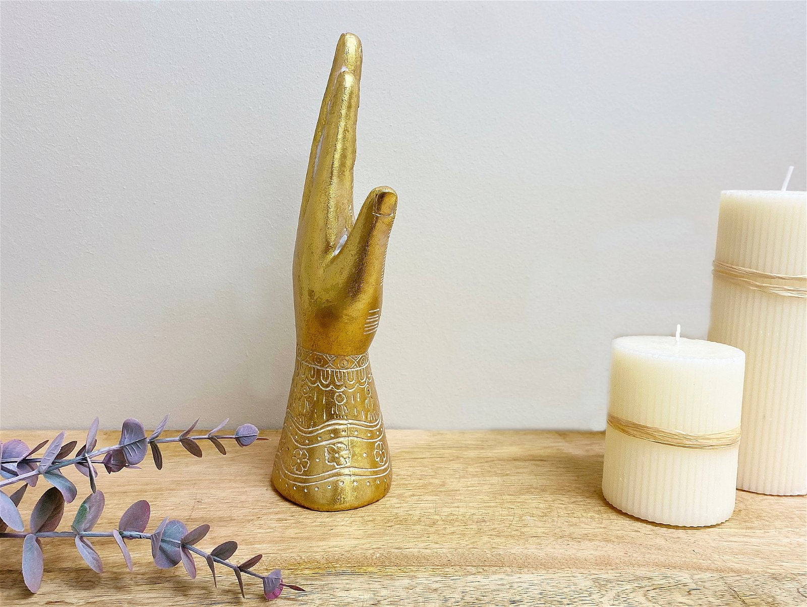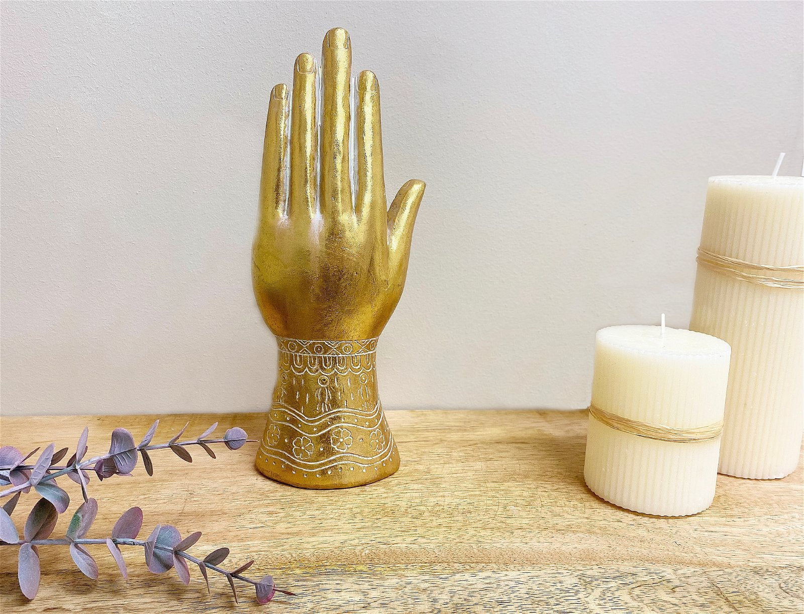 This gold hamsa ornament is a palm-shaped amulet popular throughout North Africa and in the Middle East. This interesting ornament has great detailing and has a uniqueness all of it's own. Made of polyresin painted in gold with white detailing. Measurements: D7 x H26 x W10cm