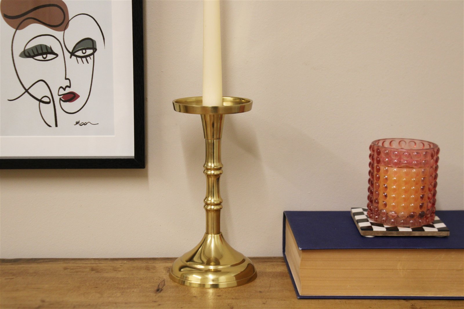 Metal candlestick in a gold colour, suitable for one dinner candle or one pillar candle up to 9cm in diameter. Traditional style candlestick holder with a 9 cm diameter drip tray. Made from Aluminium. Measurements: D10 x H25 x W10cm