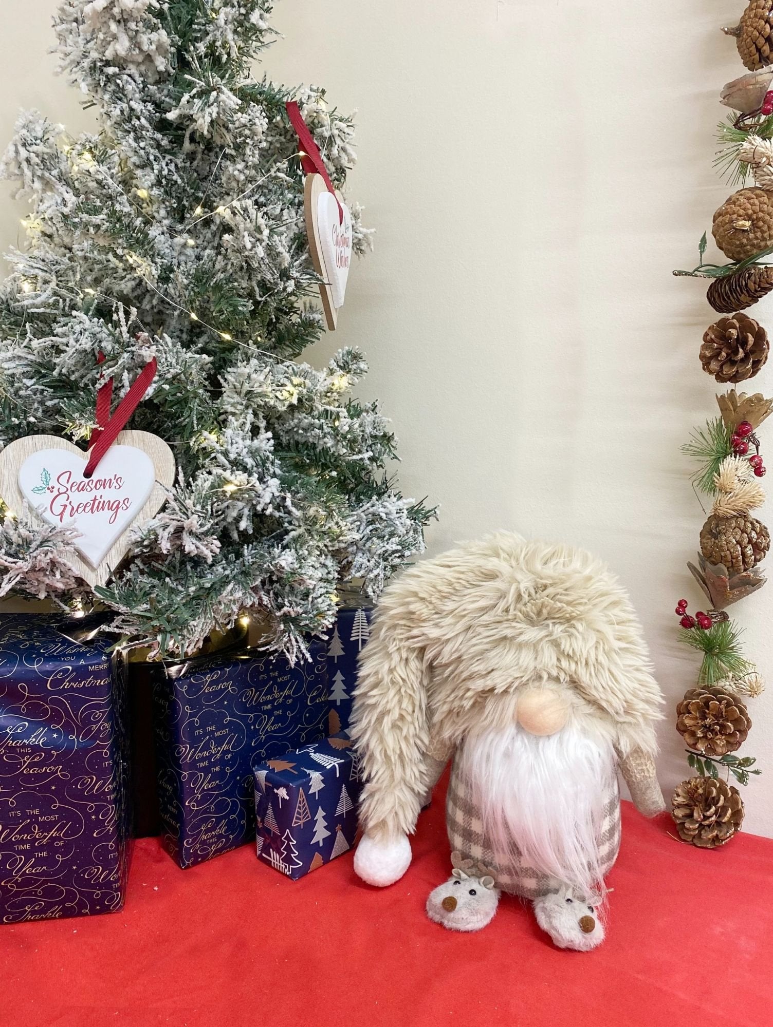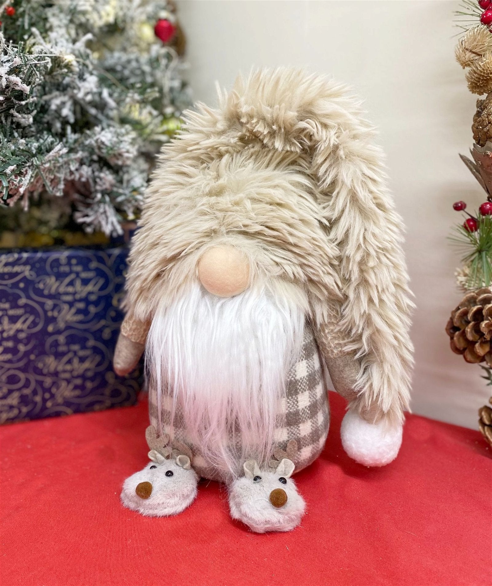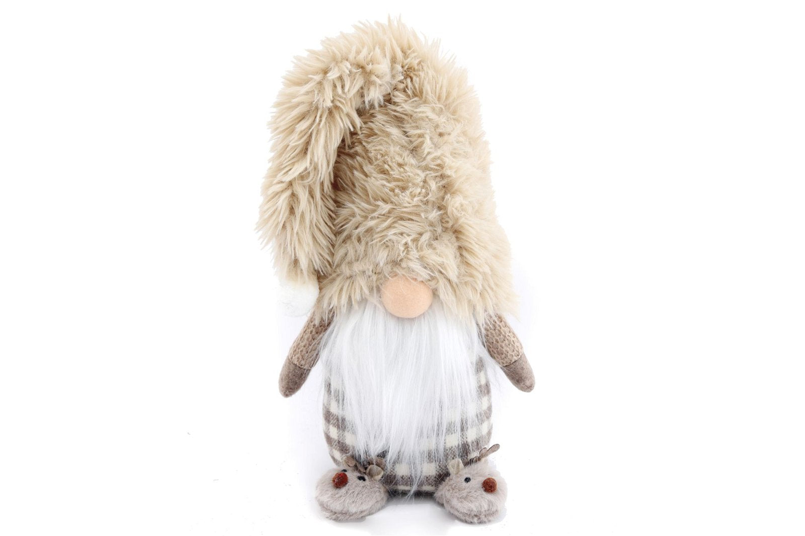 This delightful gonk has a super soft long conical floppy hat, a beige and cream check body, snowy white beard and cut slippers depicting little reindeer. He is simply adorable. His soft hat is 45cm long, his body is 13cm diameter and the reindeer slippers are 6cm x 5cm. Overall measurements are: D20 x H61 x W18cm