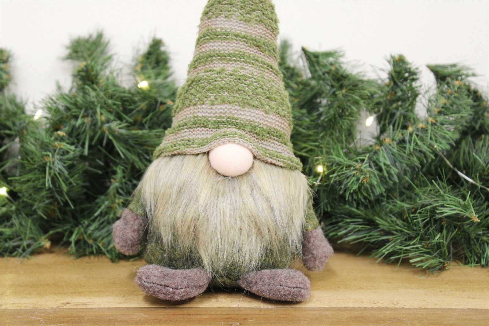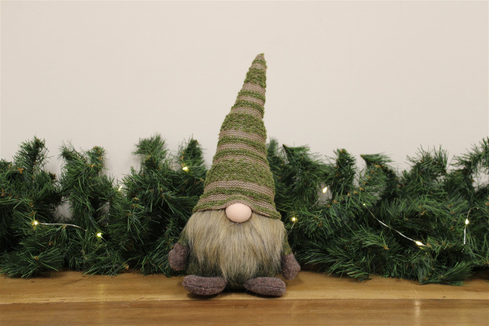 A rustic Gonk with faux fur beard. The Gonk has a woven sage green pointed hat and a cute button nose. This sitting Gonk would complement any Christmas scheme. Measurements: D11.5 x H28 x W12cm