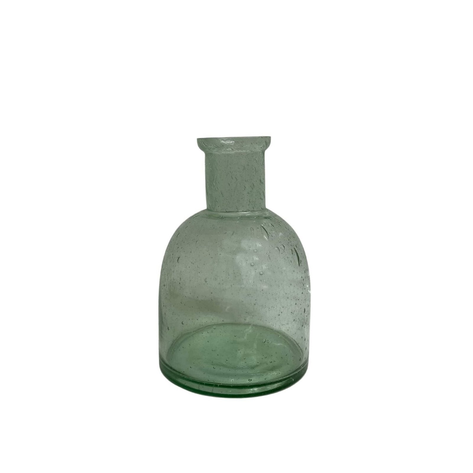 This elegant vase is blown in a domed form with a soft narrowing for the neck. The glass has a subtle hint of green and is of a bubble finish. The vase has a 13.5cm diameter narrowing to a 4cm neck and stands 19cm tall. Measurements: D10 x H15 x W10cm