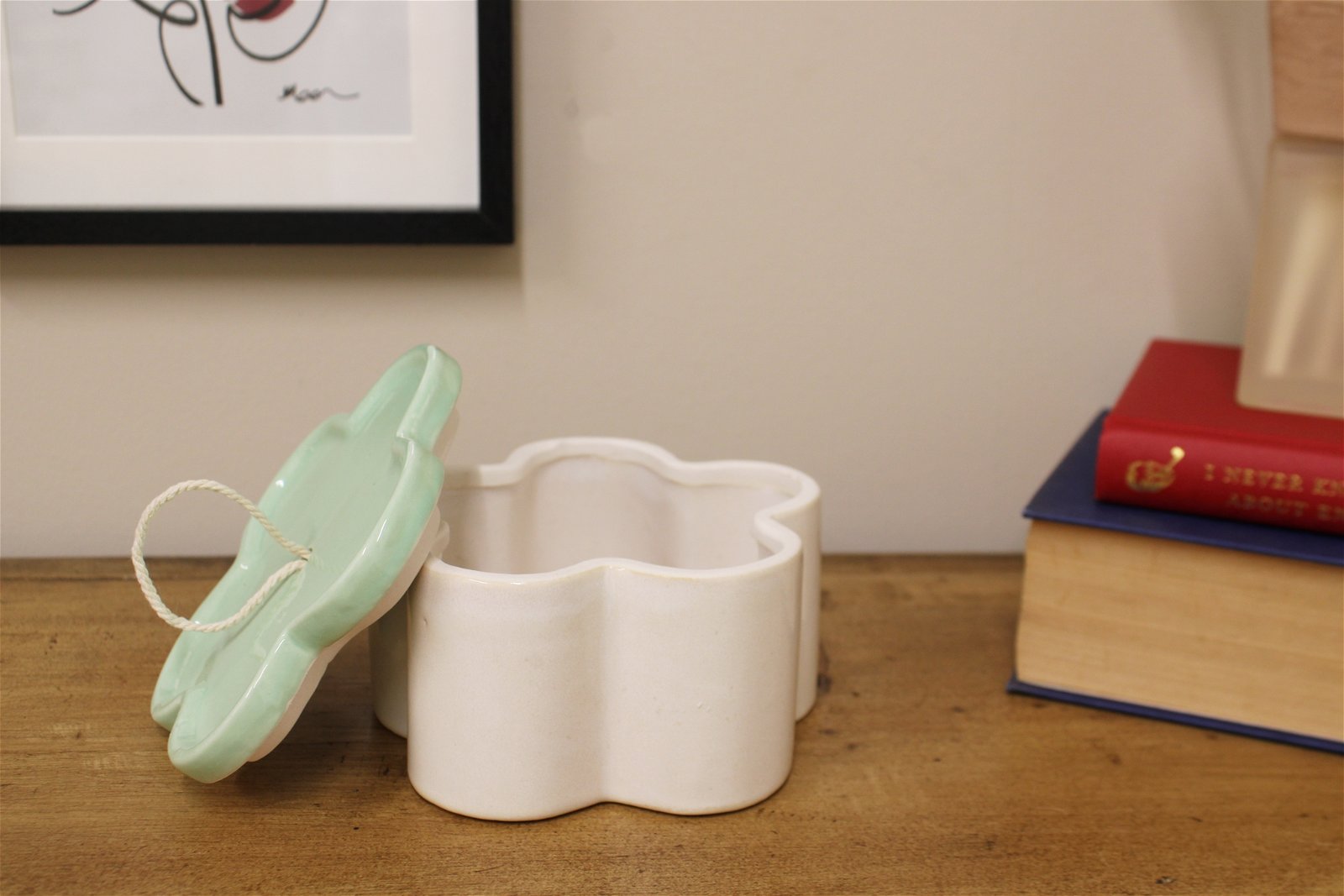 Small ceramic flower shape trinket box, with green lid. Perfect for storing small vanity items in. Measurements: D14 x H8 x W14cm