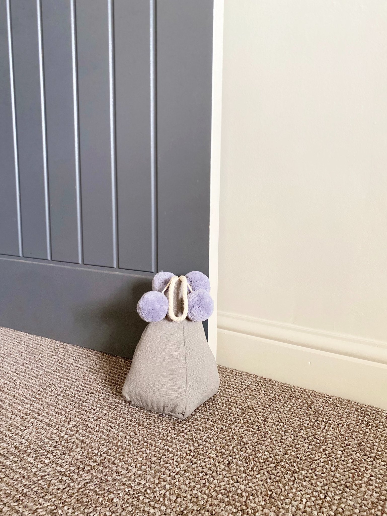 Grey triangular door stop with rope handle and fluffy pompoms. Practical and stylish triangular door stop, featuring a grey rope handle for easy transport. Finished with four fluffy grey pompoms. Measurements: D12 x H30 x W13cm