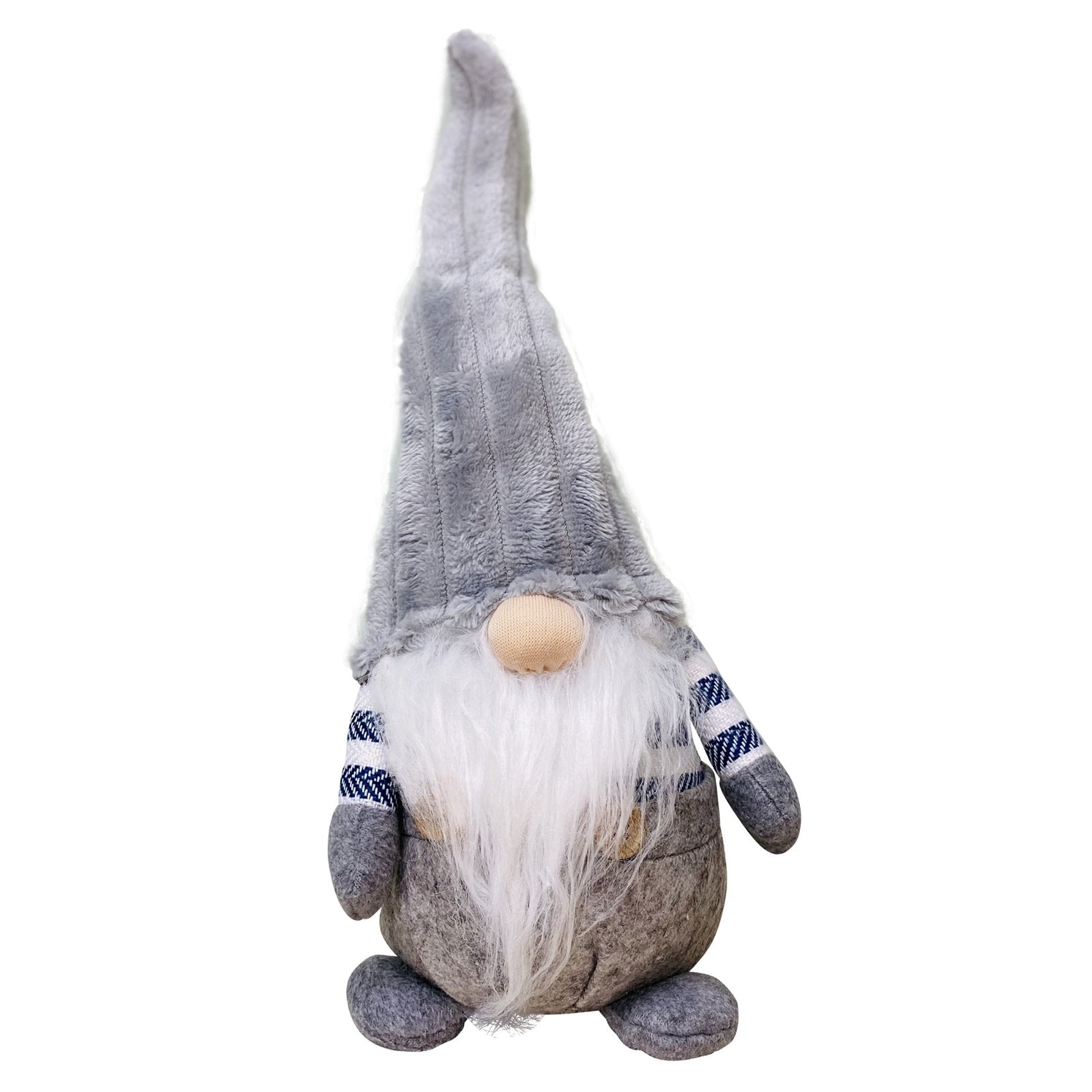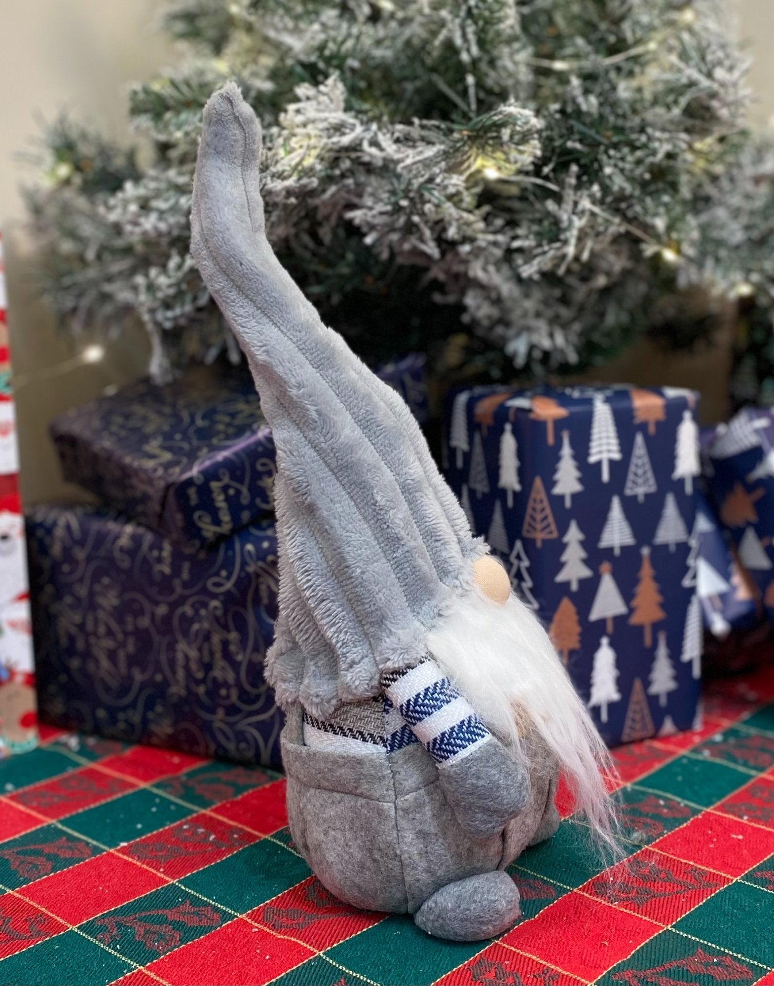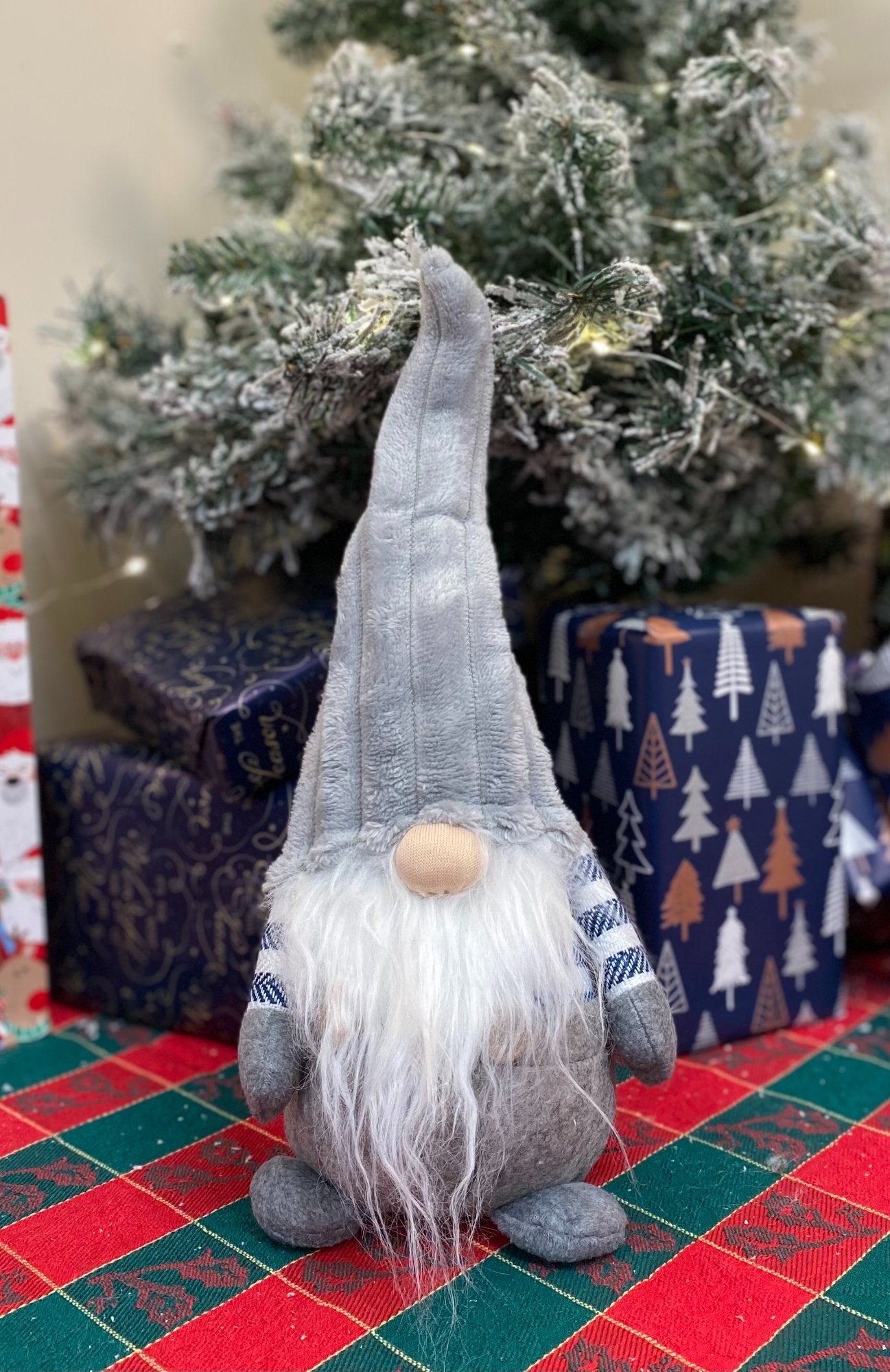 Grey fabric sitting Gonk. Festive character to decorate any home at Christmas time. The hat is strengthened by wire for support and styling. Measurements: D11 x H36 x W16cm