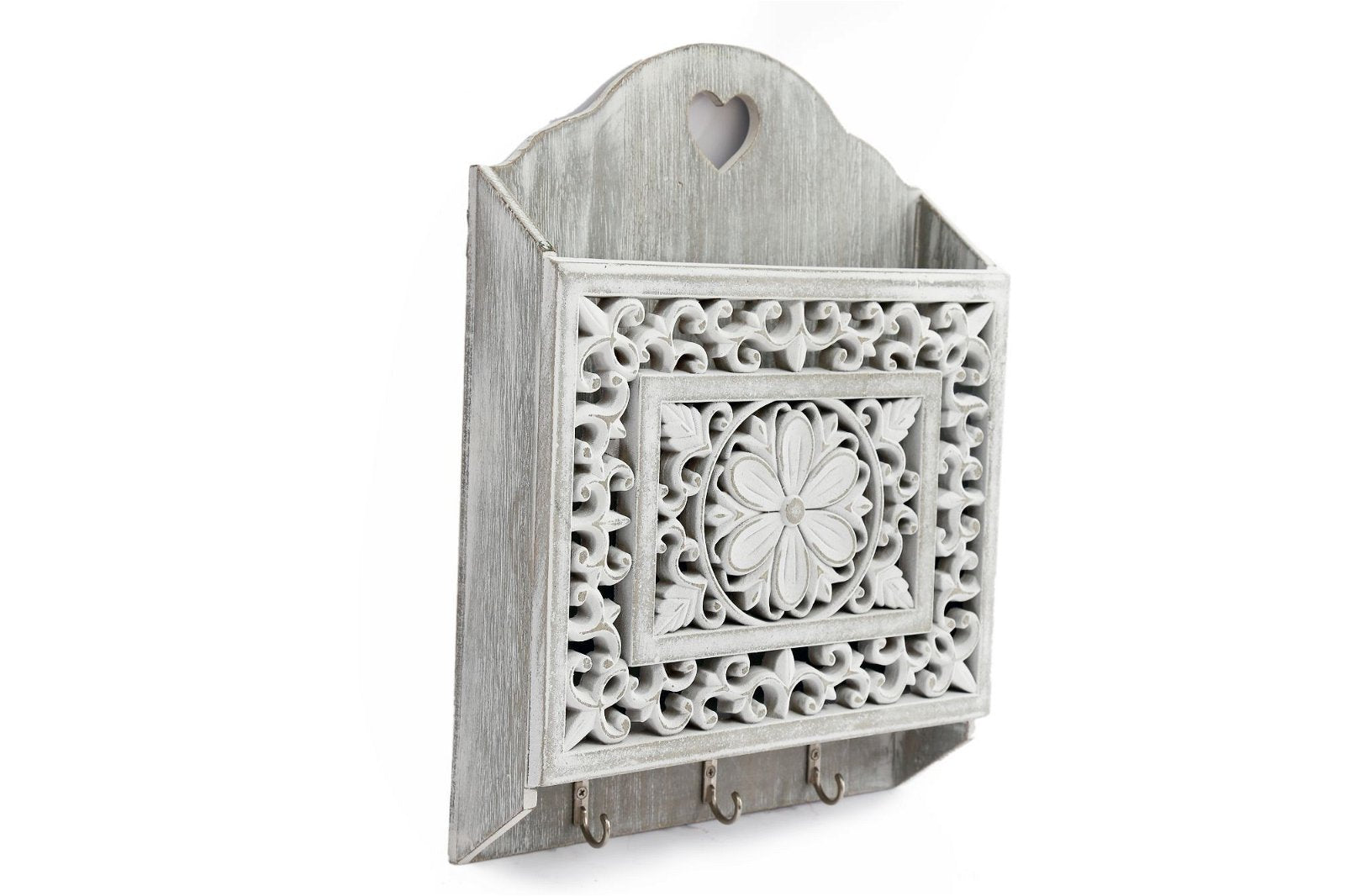 This shabby chic design in soft shades of grey and white has a handy boxed area that is decorated with a pretty carved out facing. The back board is scalloped shaped, enriched with a delicate heart shaped cut out and three handy single hooks beneath the box. A charming practical piece to compliment any home. The grey and white shades are stylish and simply stunning. The storage area is 4cm wide, 19cm deep and 23.5cm long. Overall measurements: D6 x H34 x W24cm SKU: KG1062