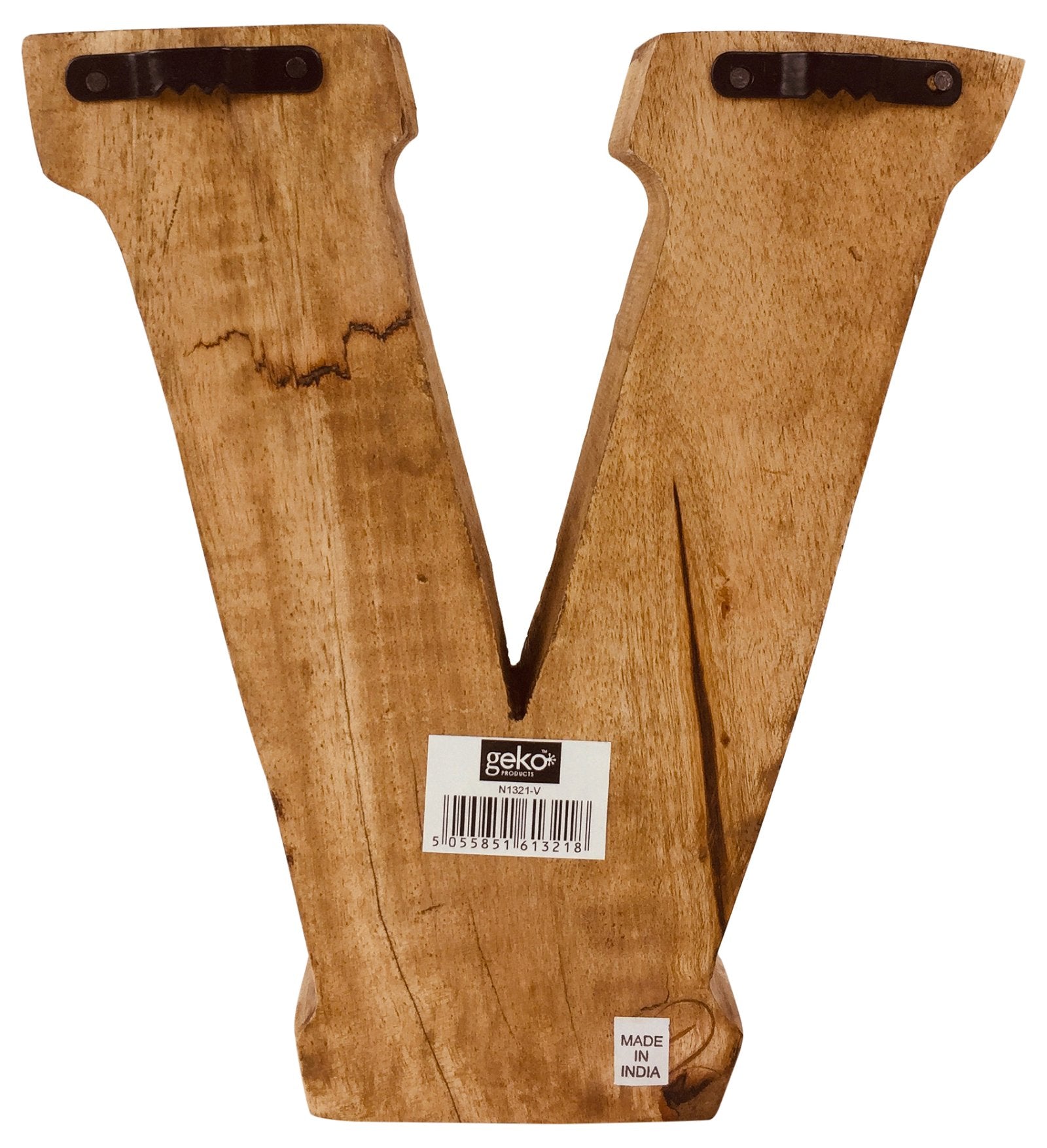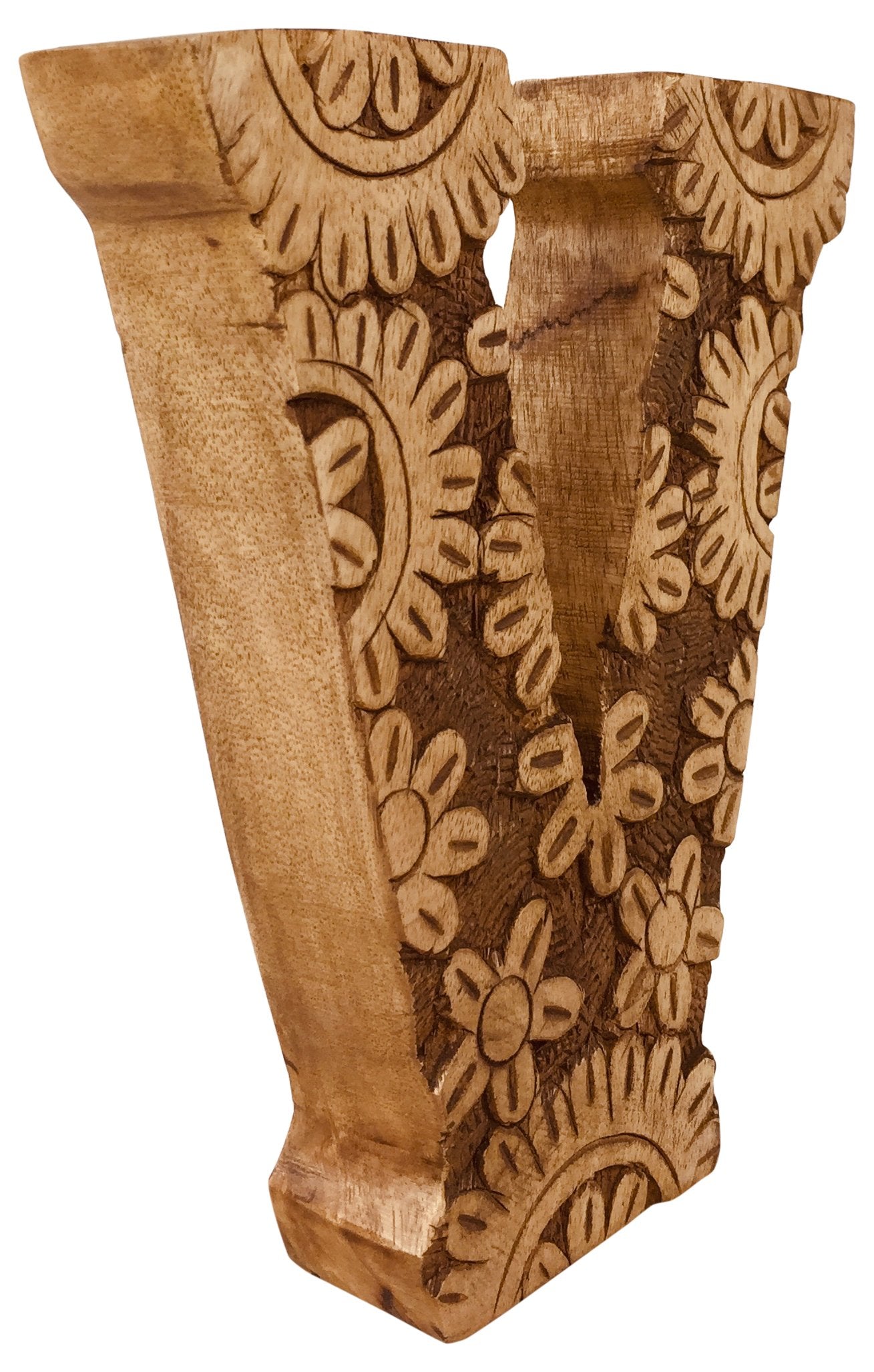A solid hand carved mango wood letter V. The letter features an intricate white flower design which is hand carved into the letter. The letter has overall rustic look and would fit perfectly into a variety of sceneries. The letter is free standing or can be wall mounted via the hanging bracket on the back. Perfect for new baby's, kid's bedrooms, christening, engagement presents, wedding's, birthday's, and bars or cafes. Measurements: W18cm X D4.5cm XH20cm. Weight: 0.52kg.