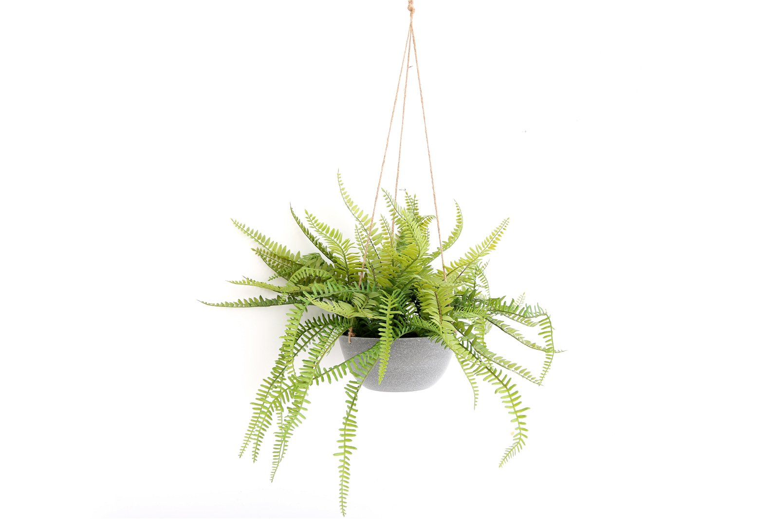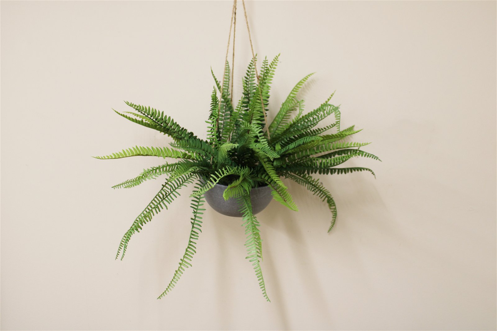 Capture a trendy look without the hassle of a live plant, with this hanging faux fern. Perfect for hanging inside or a covered outside area for a bit of greenery. Measurements: D20 x H40 x W20cm