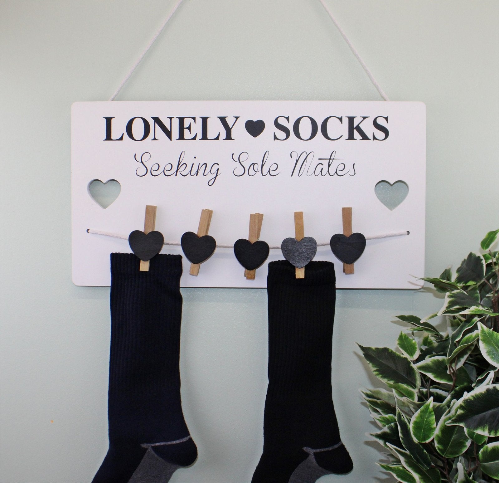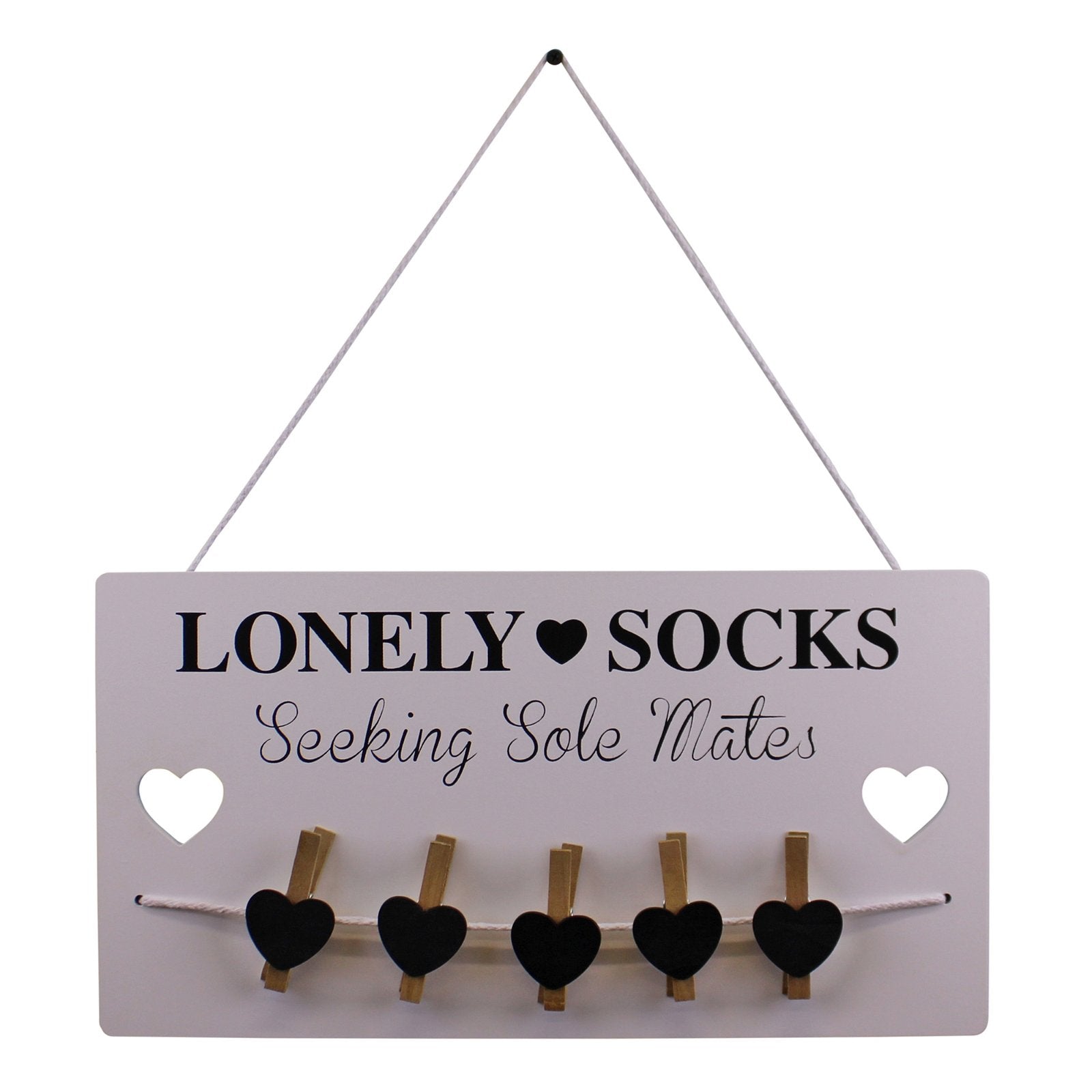 A beautiful addition to a laundry room or area in your home. Featuring the wording Lonely Socks seeking sole mates and 5 pegs with hearts to hang those pesky odd socks! Made of MDF with wooden pegs and cotton rope for hanging. Measurements: 2 x 21 x 40cm SKU: KG0389