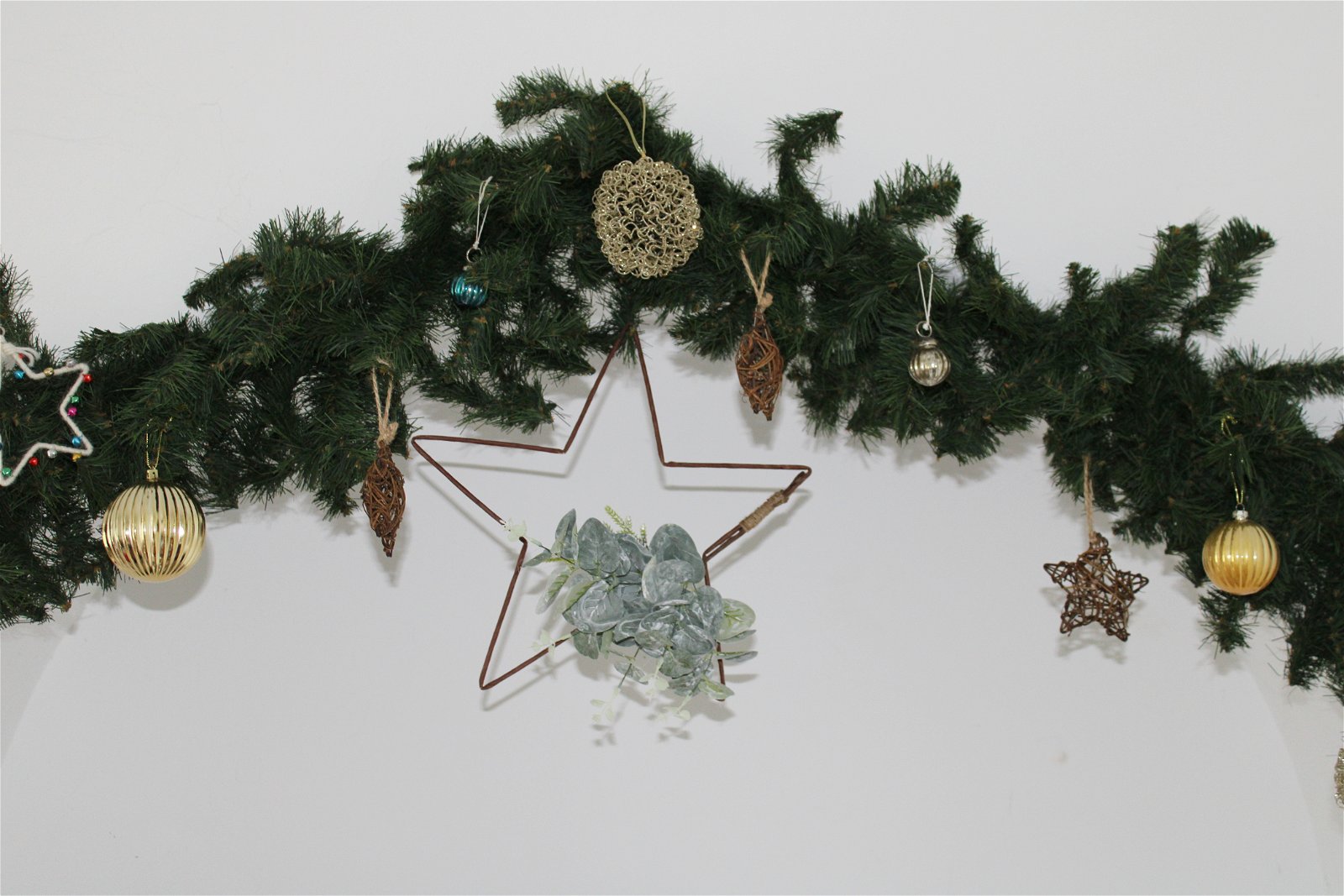 This gorgeous minimal Christmas decoration is made out of a rustic metal frame decorated with a sprig of faux winter foliage of eucalyptus leaves, meaning they can be enjoyed for years to come. With a diameter of 33cm, hang this star high with the rustic rope loop or nestle within the branches of the Christmas tree for a modern take on festive décor. Measurements: D1 x H33 x W33cm
