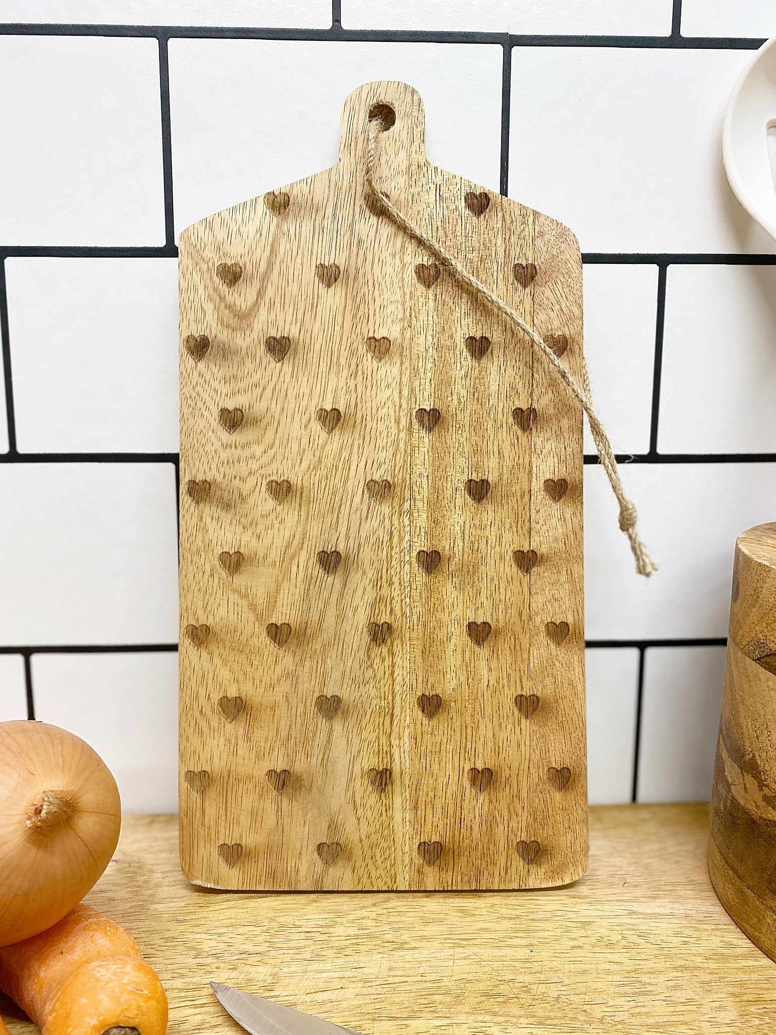 A wooden cheese board with an engraved hearts design on the front, with a jute string loop. The cheese board is 30cm in length including the handle and made from 100% Mango Wood. Measurements: D15.5 x H1 x W30cm