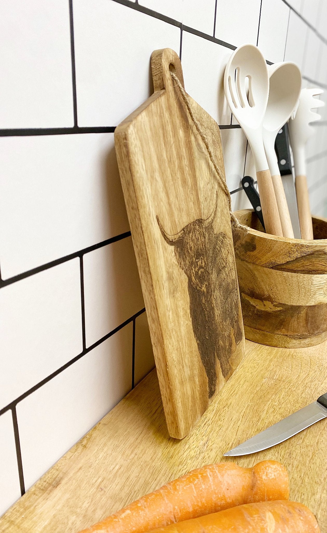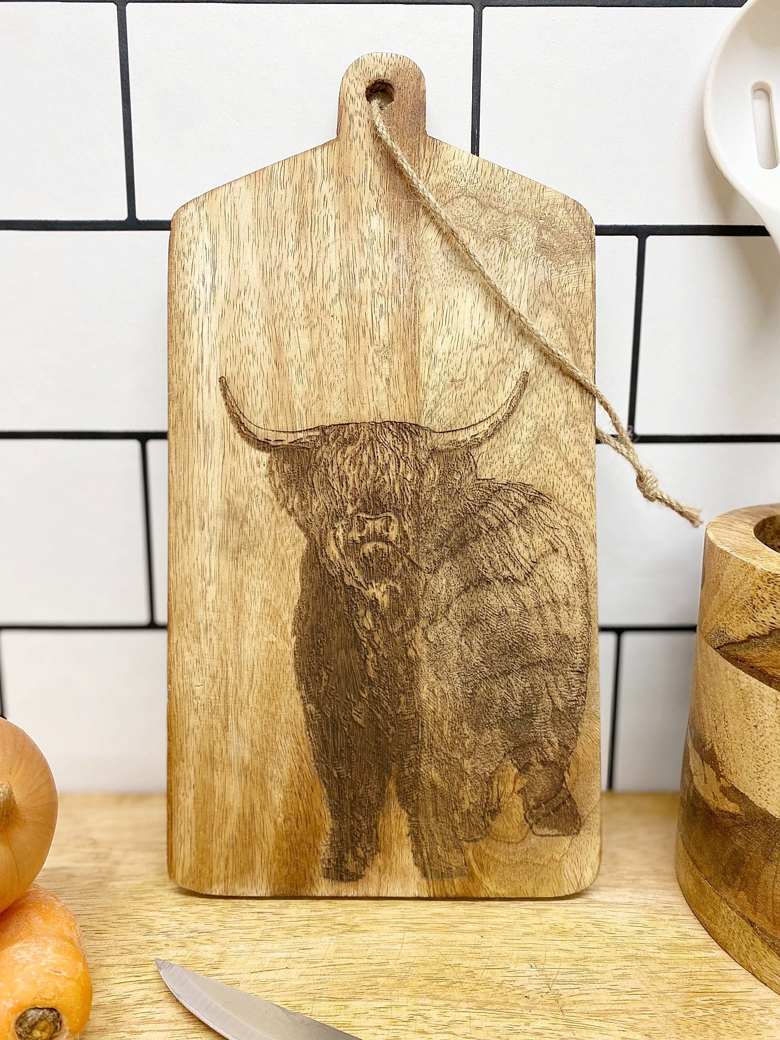 A wooden cheese board with an engraved portrait of a highland cow on the front, with a jute string loop. The cheese board is 30cm in length including the handle and made from 100% Mango Wood. Measurements: D15.5 x H1 x W30cm