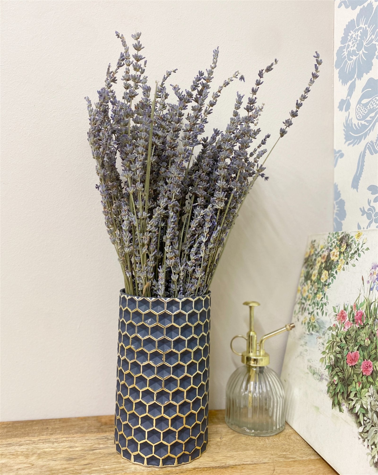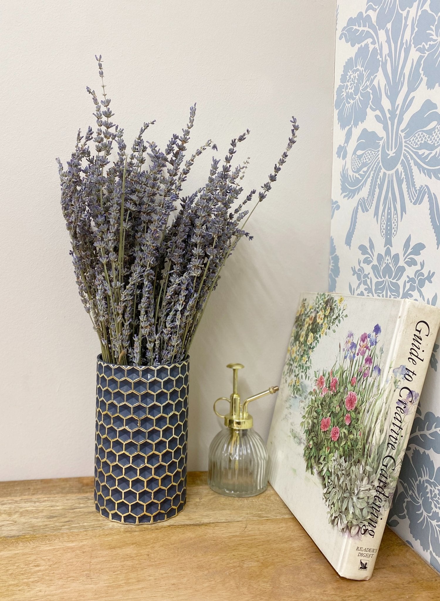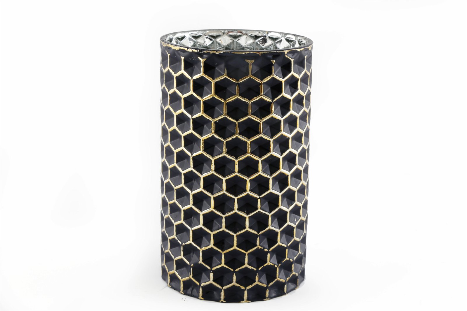 Add a touch of natural elegance to your home decor with this beautiful honeycomb cylinder vase, in black. Made from high-quality glass, this vase features a stunning gold edged honeycomb pattern on its cylindrical surface, adding depth and texture to its design. The perfect size for holding flowers, branches, or other decorative items, and its sturdy cylindrical shape provides a stable base for tall or large arrangements. Measurements: D11 x H18 x W11cm