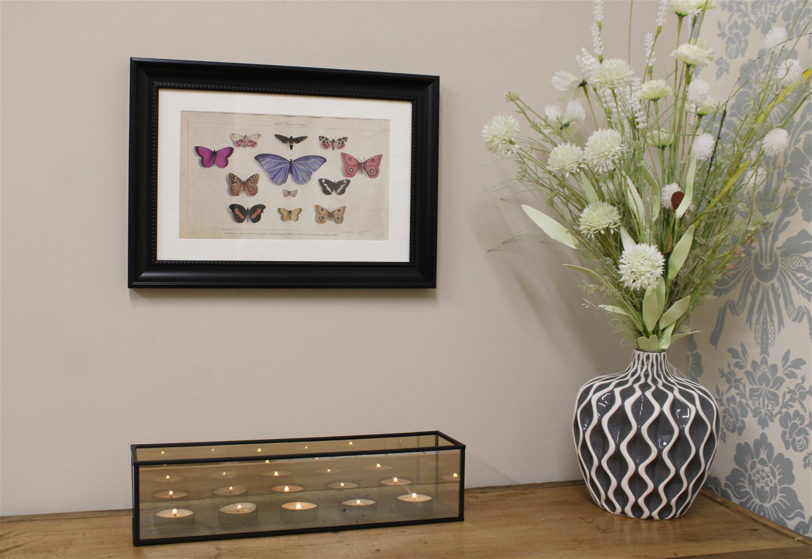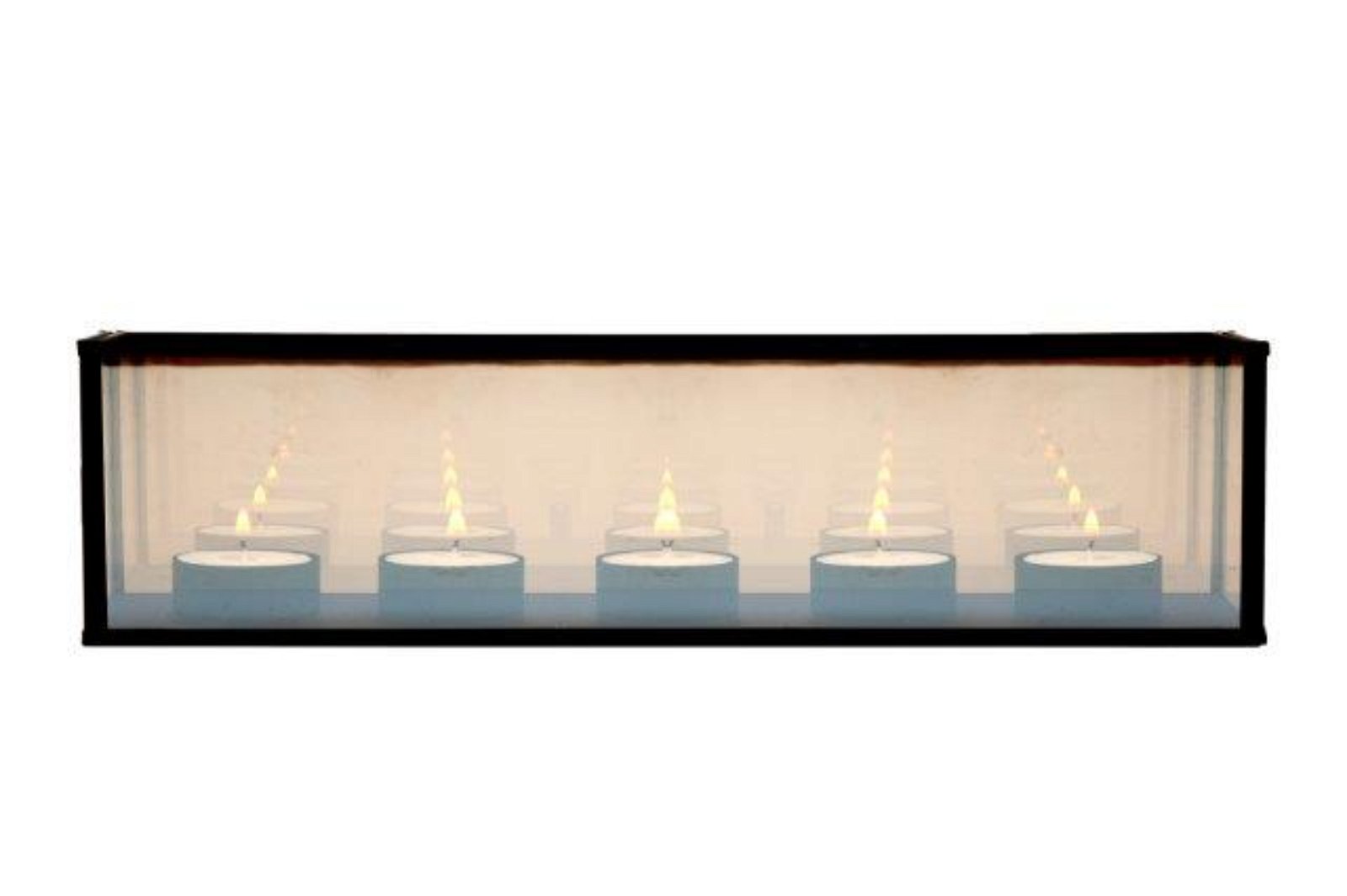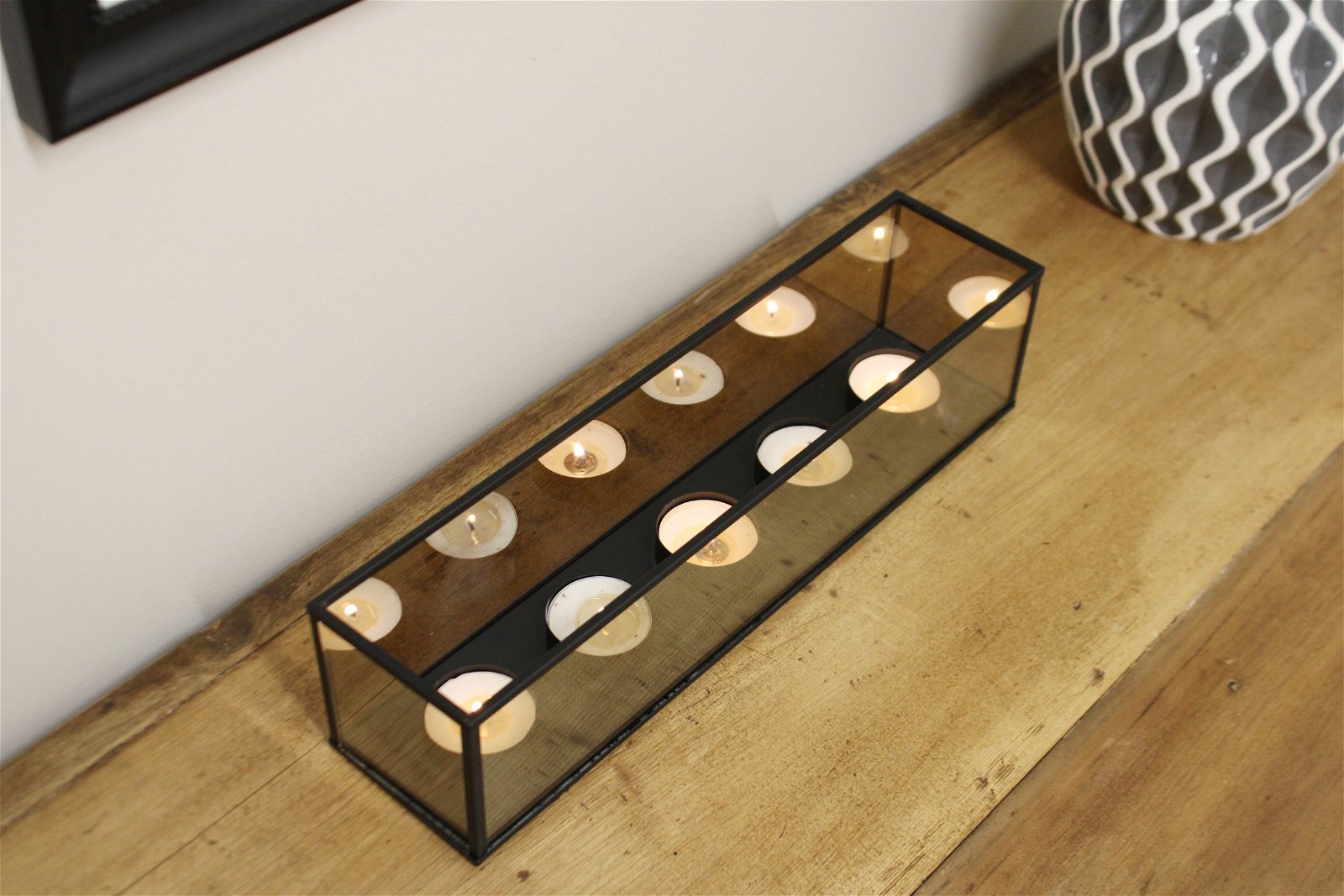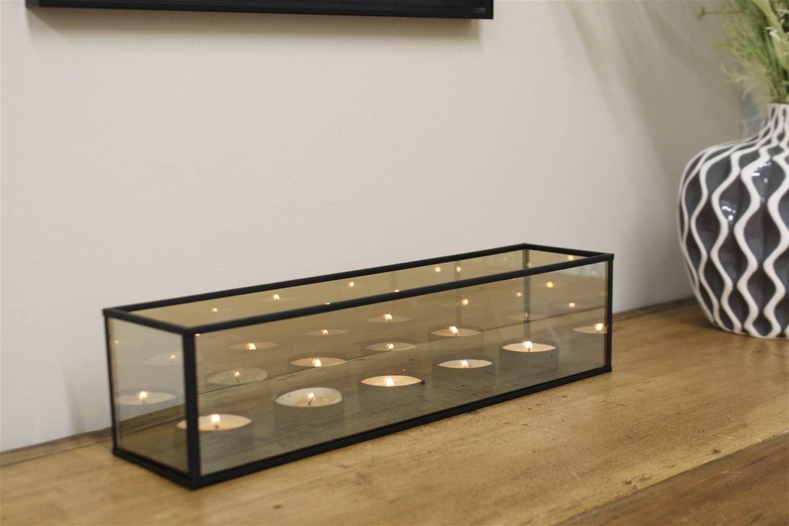 Add this unique piece to any mantel or tabletop for an enchanting new centrepiece. This mirrored rectangle box will reflect your burning candles creating an endless light effect. The tealight holder frame is made from iron with mirrored glass panels. Measurements: D8.5 x H8 x W34cm