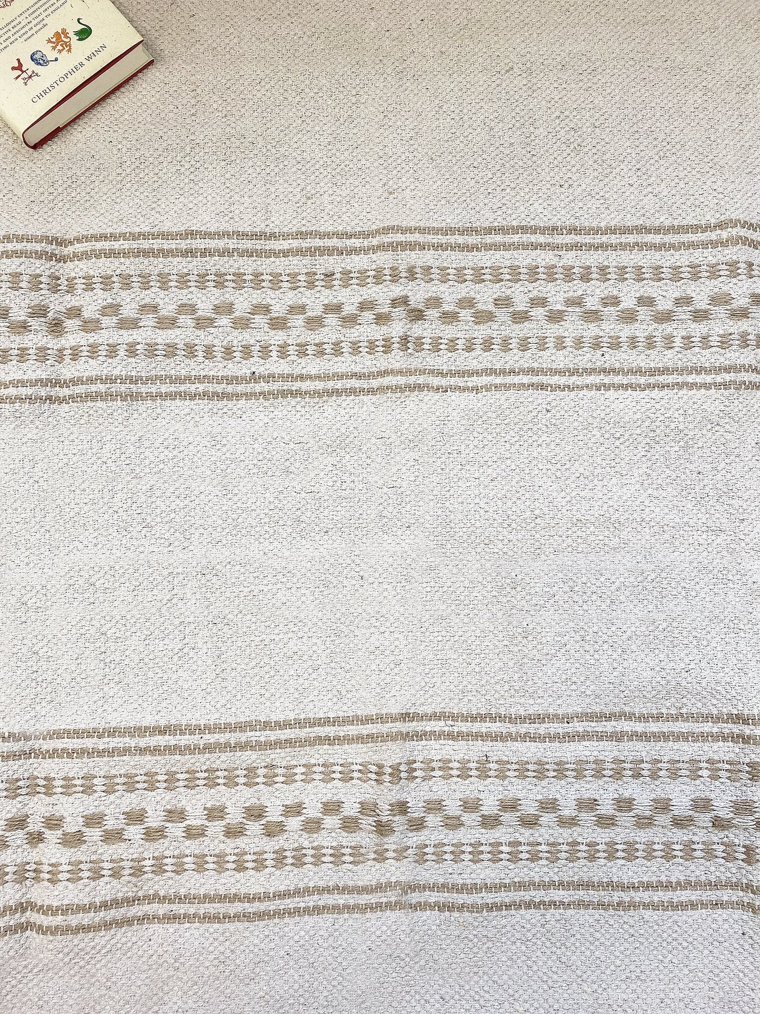 Large natural and eco-responsible jute rug in white with stripe design. Made from 100% jute which is a highly durable material, ideal for areas of heavy footfall. Measurements: D1 x H180 x W120cm