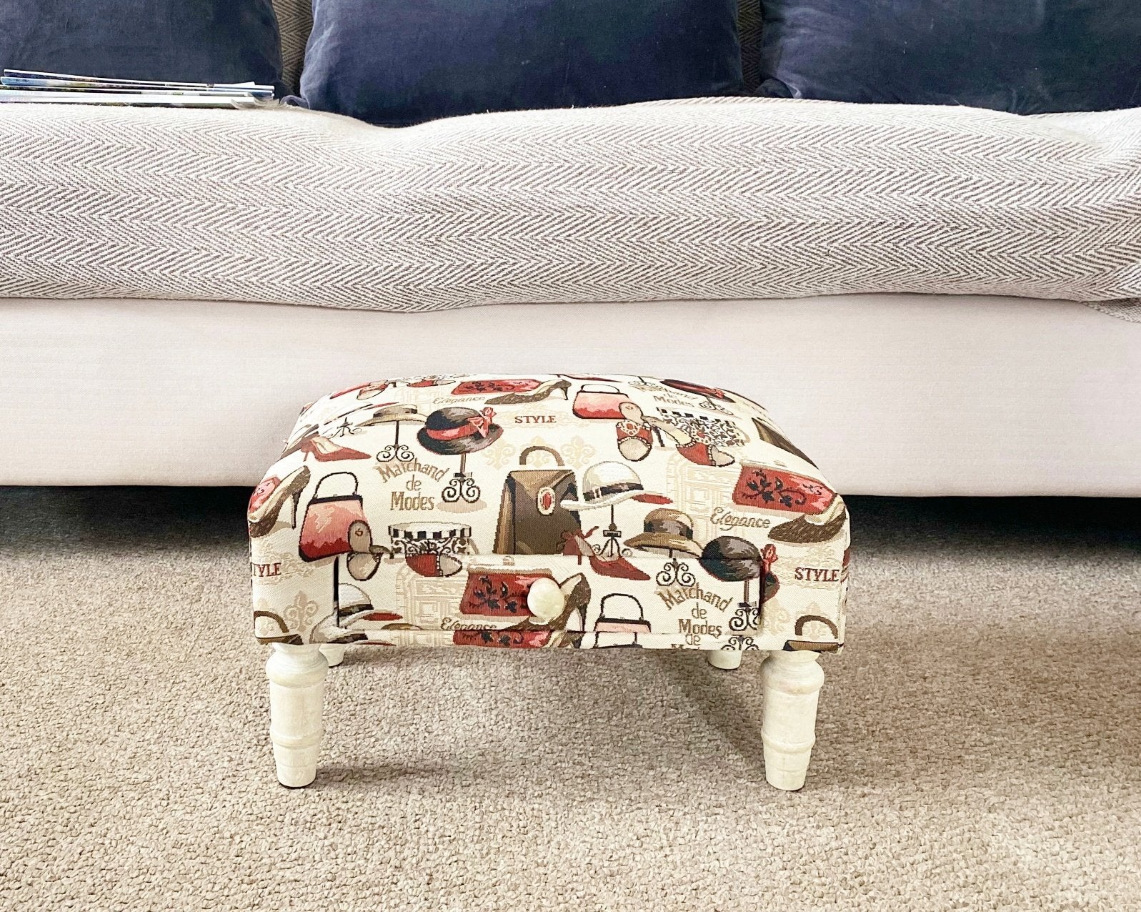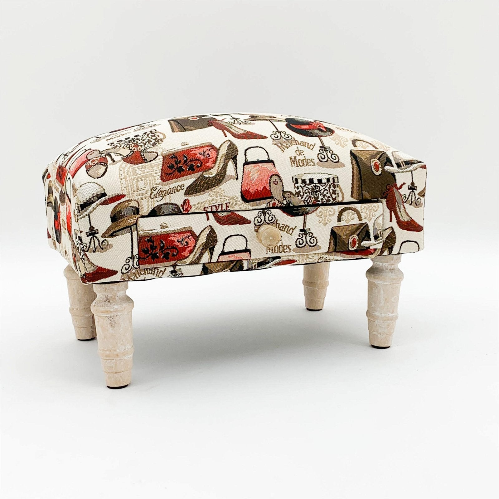 Ladies accessories fabric footstool with a single drawer. A sturdy footstool covered in a ladies accessories design, featuring handbags, heels and hats. The footstool has a useful storage drawer with a wooden handle, it is both practical and stylish in all homes. Wooden legs are included inside the footstool, the legs screw into the base, no tools are required. Inside drawer measurements (W x D x H): 27cm x 22.5cm x 5cm. Legs are 11cm in length. Measurements: D26 x H28 x W41cm