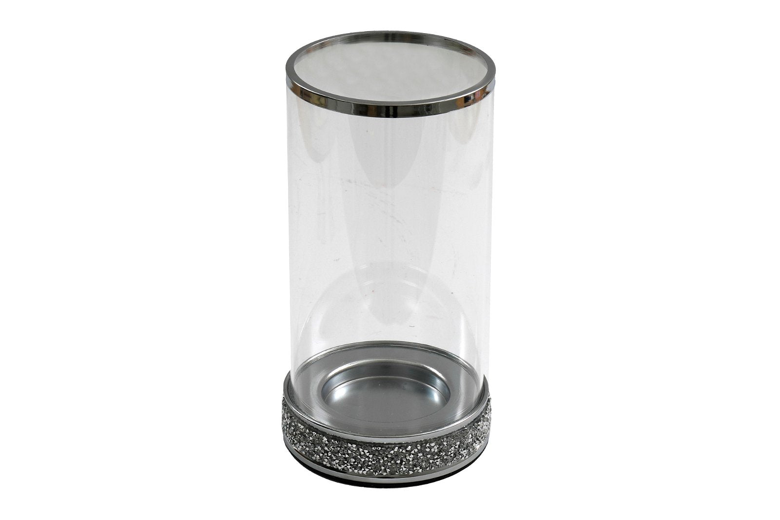 A beautiful pillar candle holder with scatter gem detail paired with polished chrome and glass. This statement piece will add a touch of glamour to any room. Measurements: D13.7 x H26 x W13.5cm