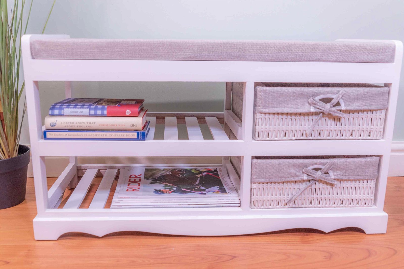 This modern and stylish white shoe rack bench with 2 white wicker drawers would be perfect for the hall way or even bedroom with great storage for shoes and other accessories. The shoe racks overall external dimensions are W80cm x D35cm x H45cm. The cushion is a grey fabric and the dimensions are W77cm x D35cm x H4cm. The 2 white wicker drawers have a grey fabric insert and the external dimensions are W30cm x D34cm x H12cm. The internal dimensions of the wicker baskets are W28cm x D32cm x H10cm. The shoe rack dimensions are W44cm x D35cm x H13cm. The product has rubber floor protectors on all four corners. Overall measurements: H45 x W80 x D35cm