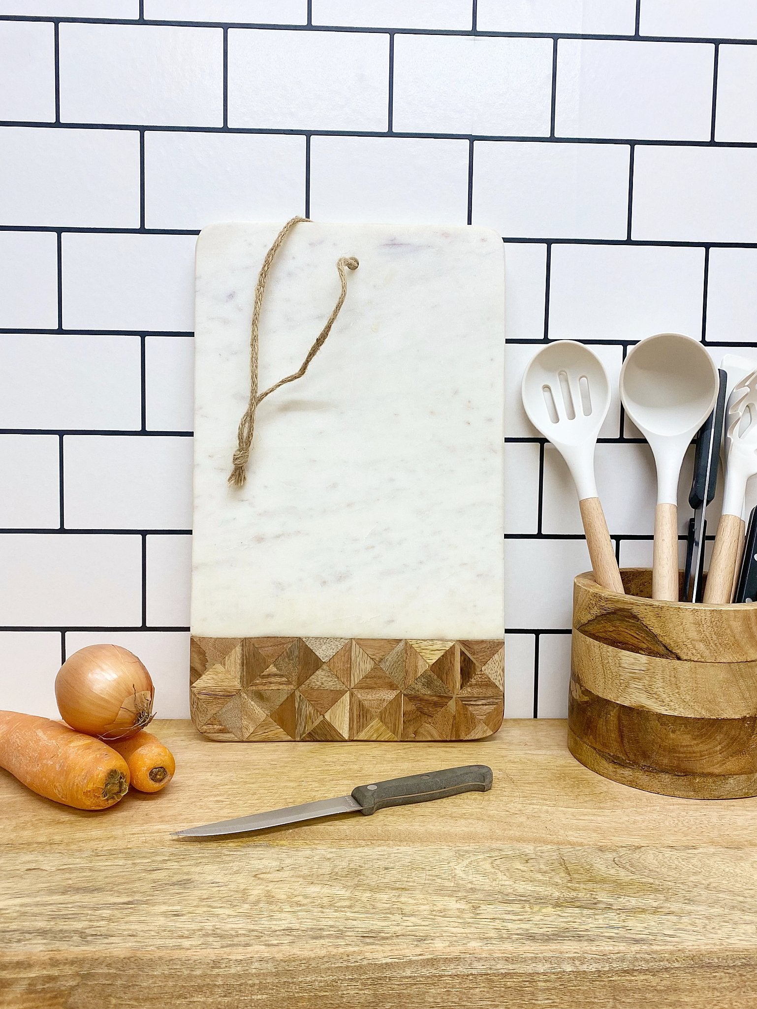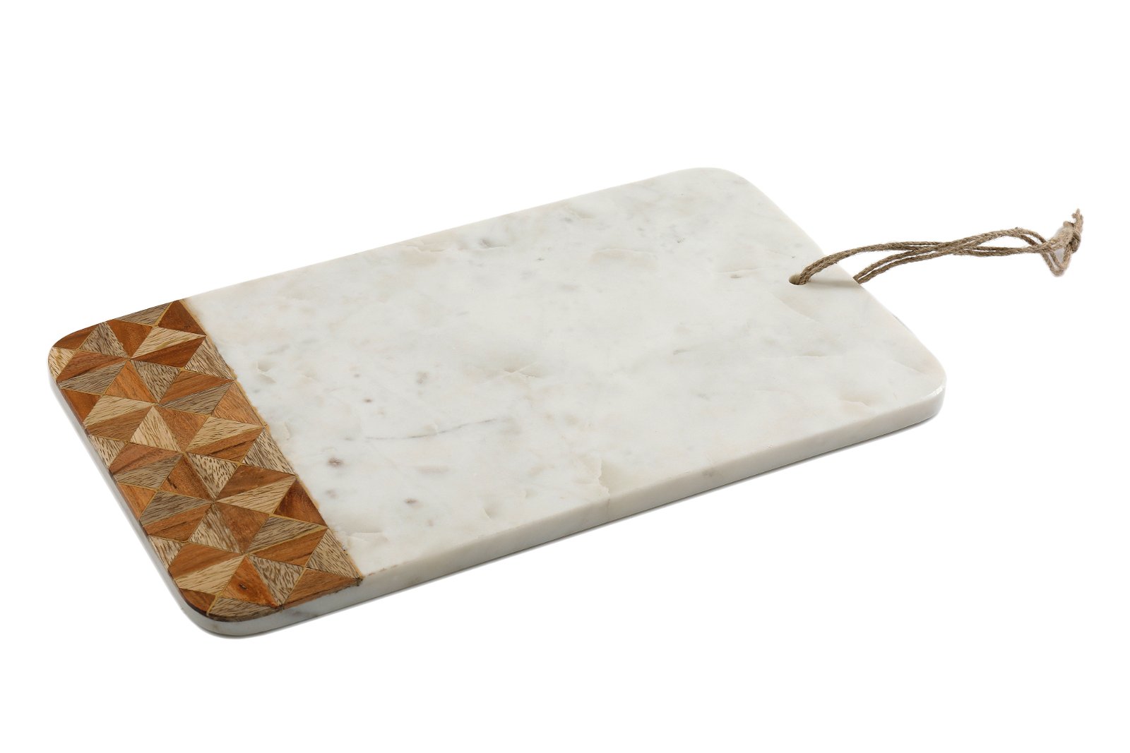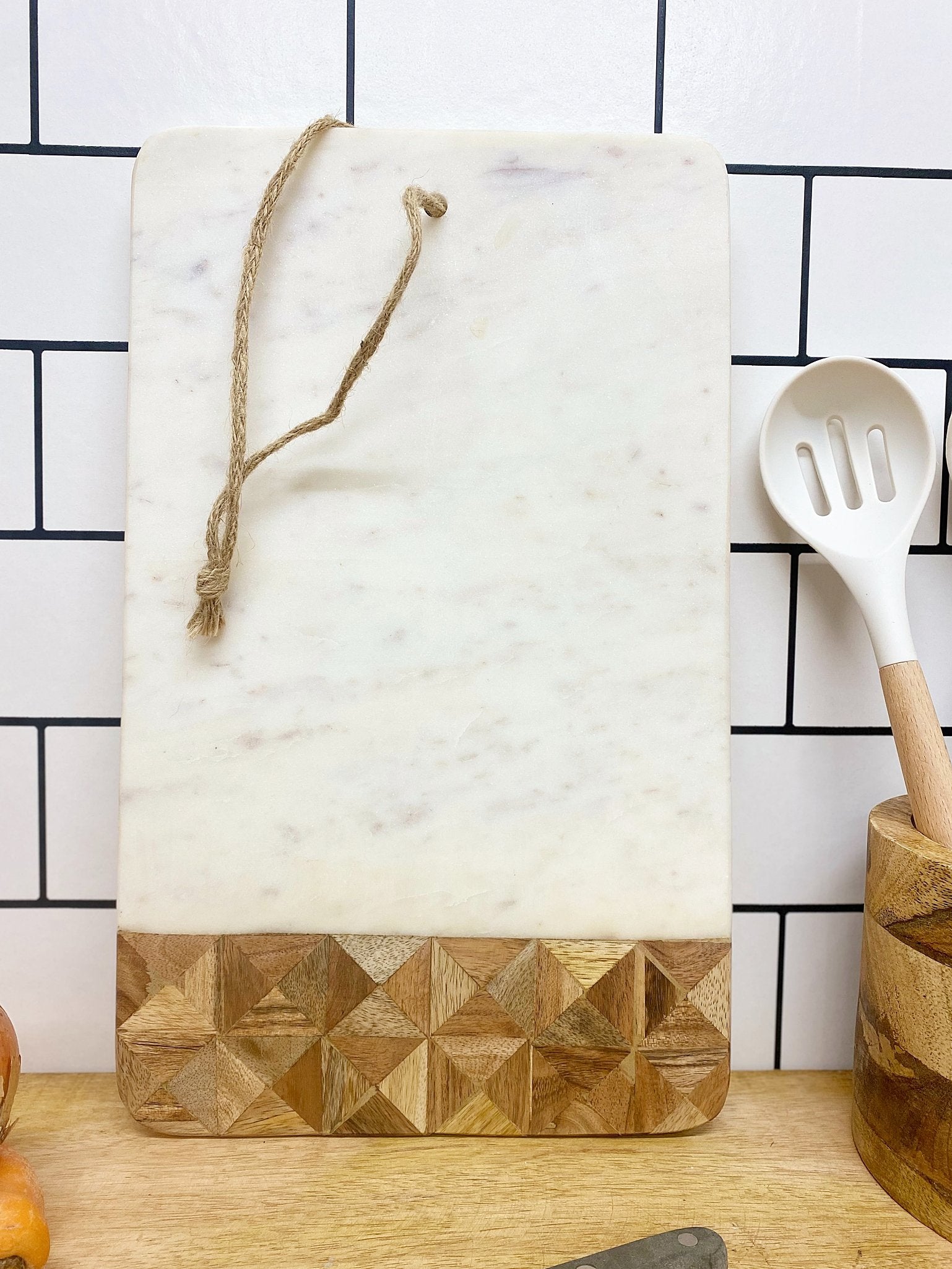 A marble chopping board with a wooden design and a jute string loop. This tasteful chopping board is made in Marble with a Mango Wood design at the bottom. This chopping board is food safe. Measurements: D24.5 x H1.5 x W40cm