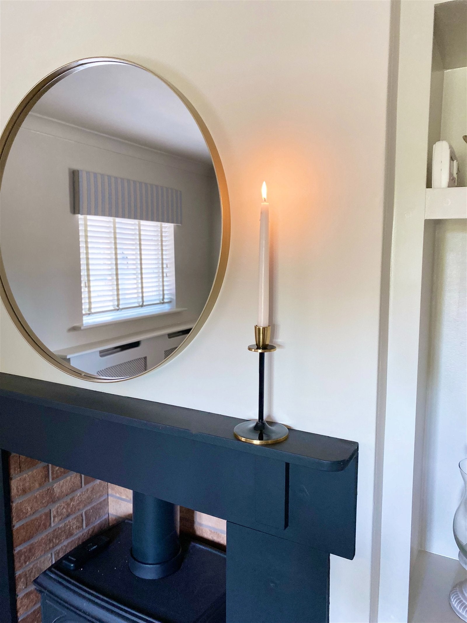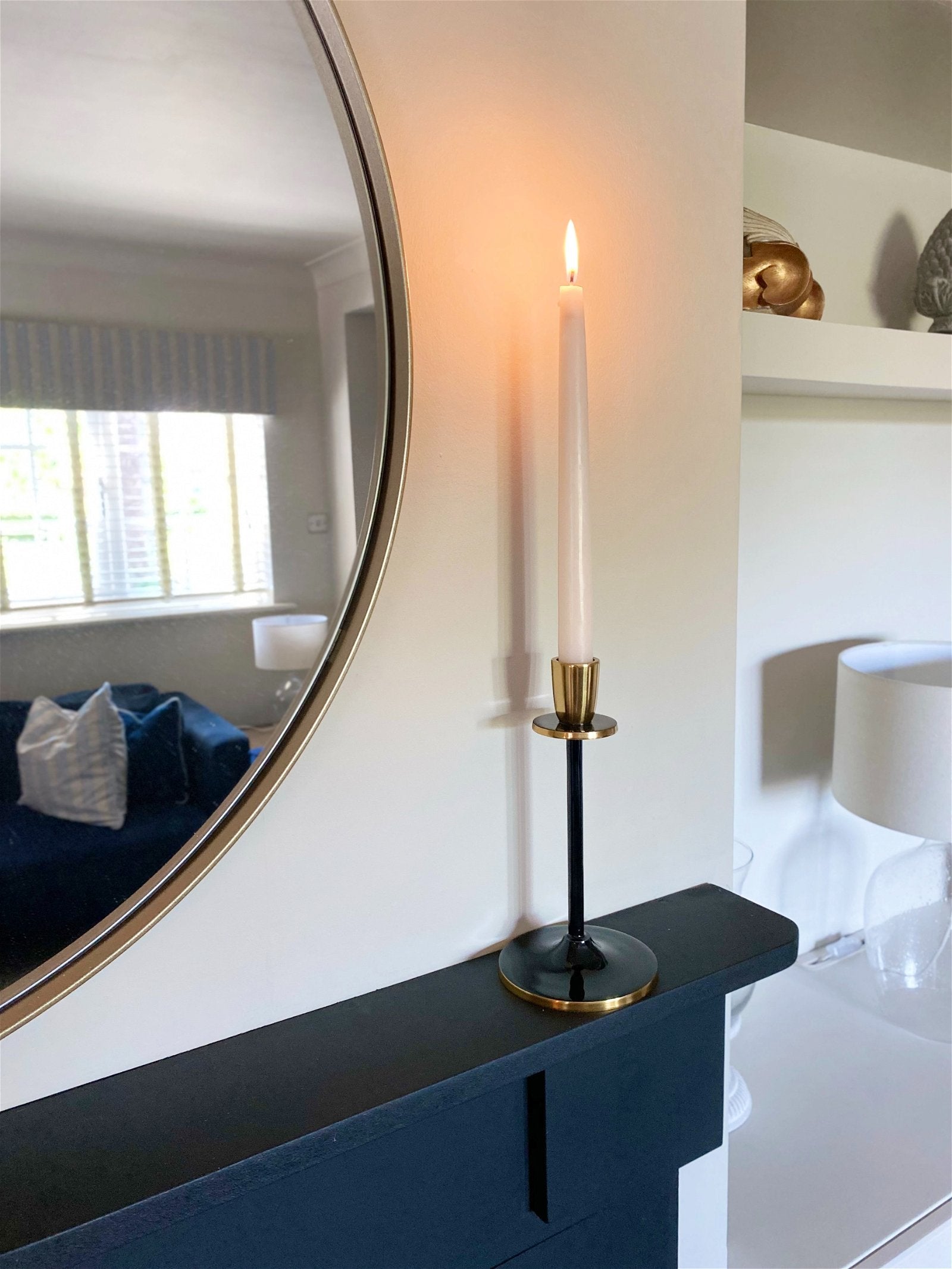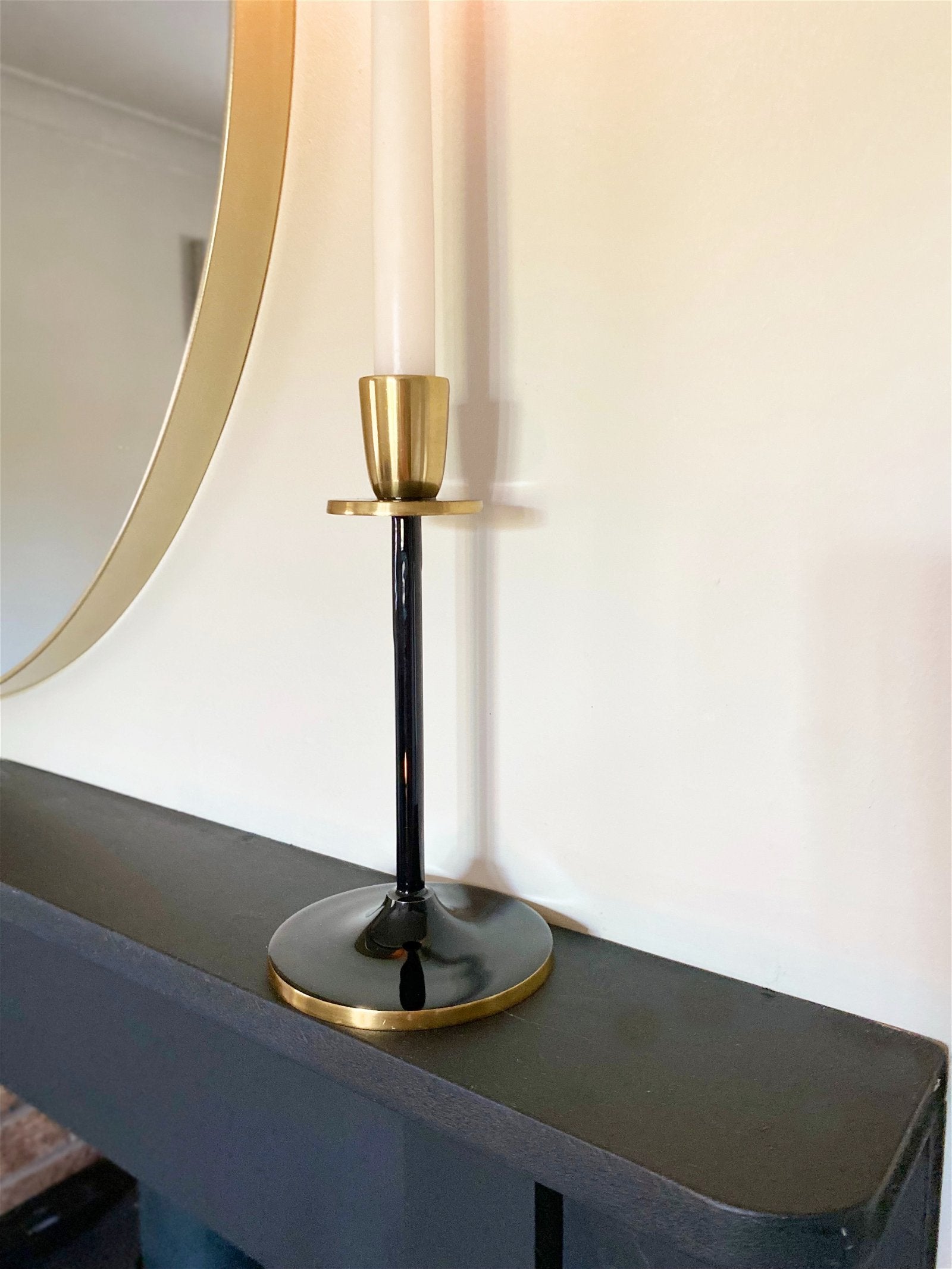 A single retro style, black and gold candle stick holder, with round base. Holds one taper candle. Gold coloured top and trim around base and drip tray, with black stem and base. This candlestick holder is made from 100% Aluminium. Measurements: D10 x H20.5 x W10cm