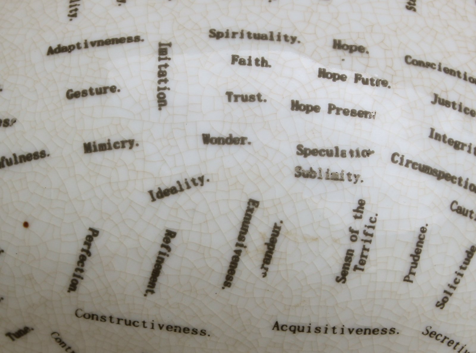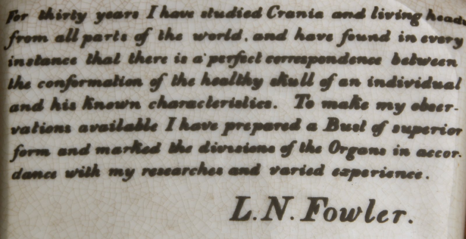 Phrenology is from Ancient Greek meaning 'knowledge'. It is a pseudoscience which involves measuring bumps on the skull to predict mental traits. This ceramic phrenology head stands 25cm tall and features a quote from Mr L N Fowler, the founder of the art along with the sections of the head and their characteristics. Made of ceramic, off white in colour with a crackled finish and black lettering. Measurements: 14 x 25 x 12cm