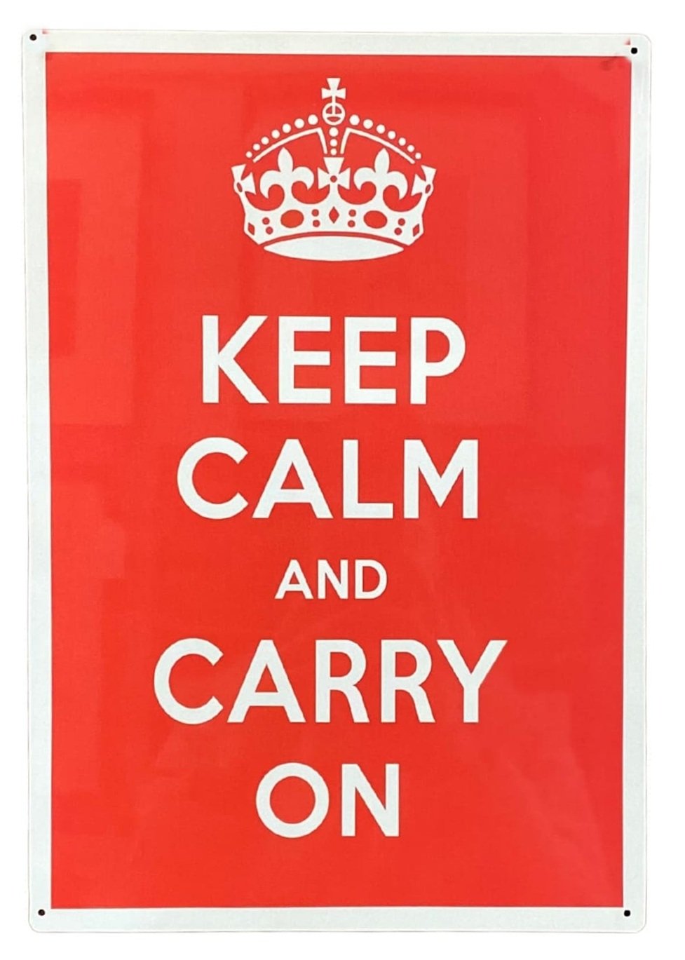 Part of our fantastic range of reproduction vintage metal signs. Keep Calm And Carry On sign. Made in the UK from aluminium, suitable for use inside or outside. Every poster features 4 drill holes for ease of fixing to the wall. Measurements: D0.1 x H41 x W28cm