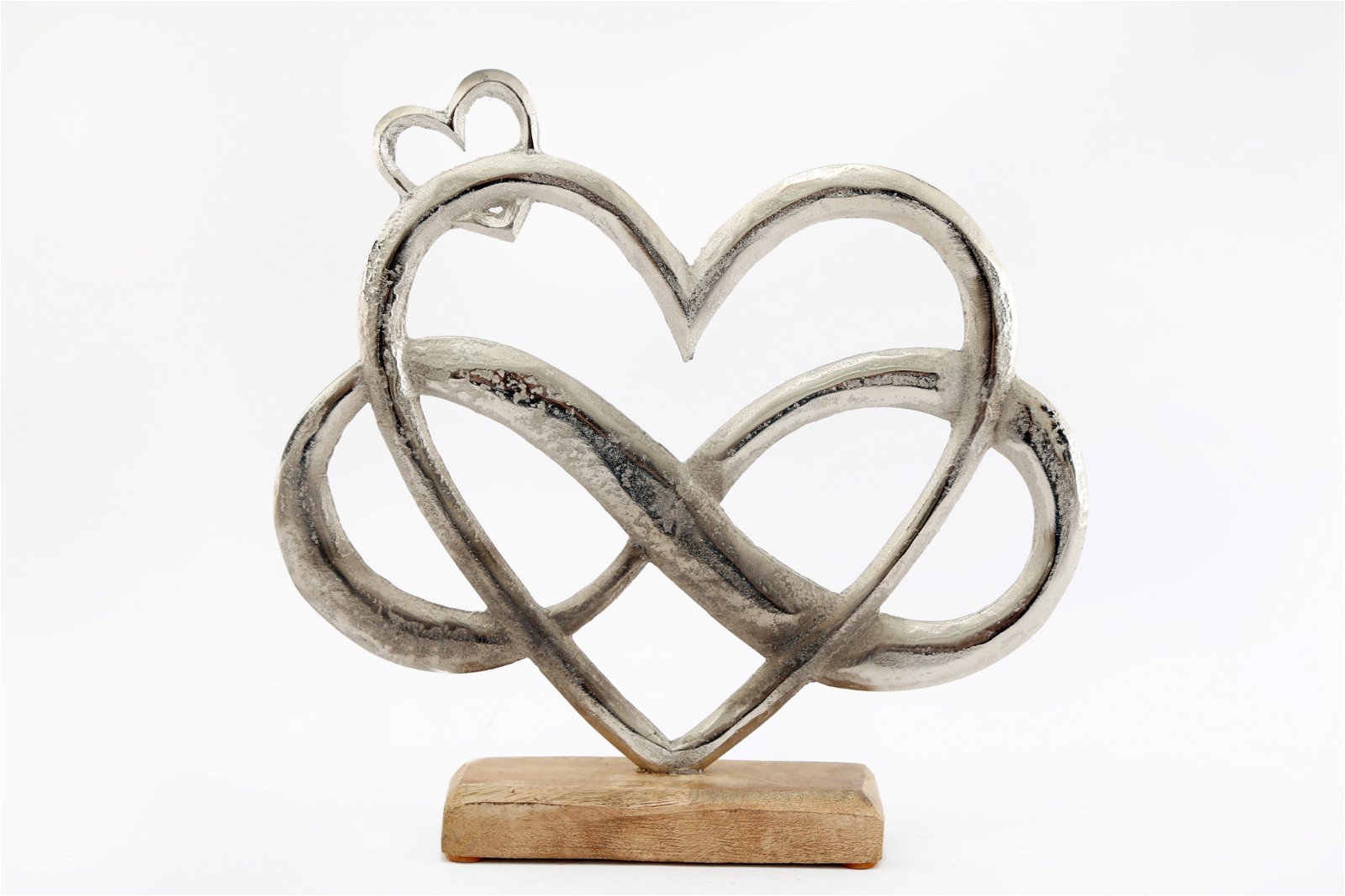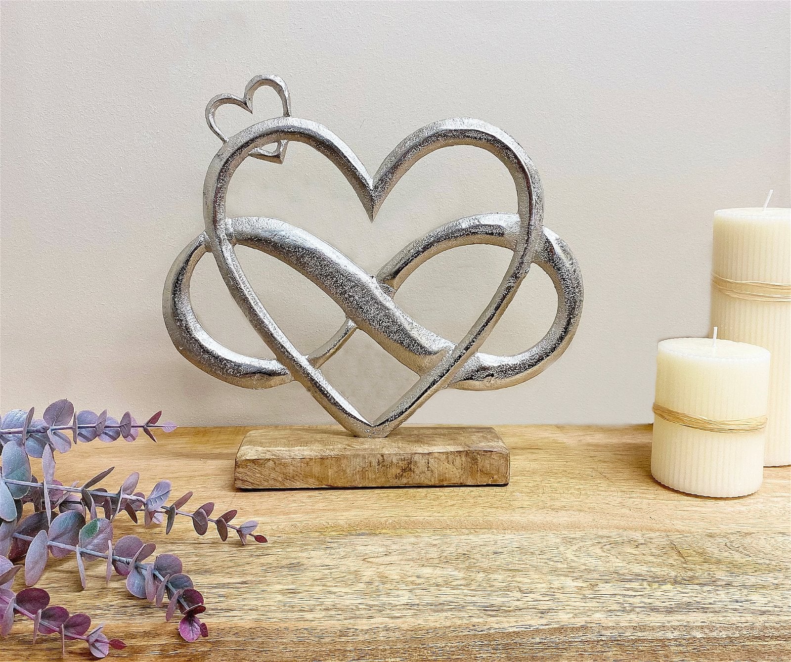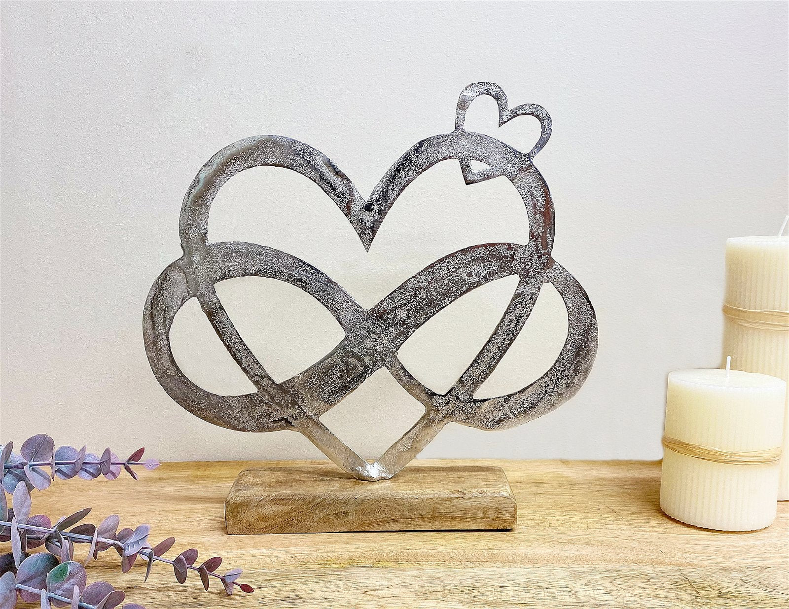This large silver metal entwined hearts ornament set on a wooden plinth would be sit beautifully in any home. This stylish piece has a pitted finish giving definition and texture. Measurements: D5.5 x H26.7 x W28cm
