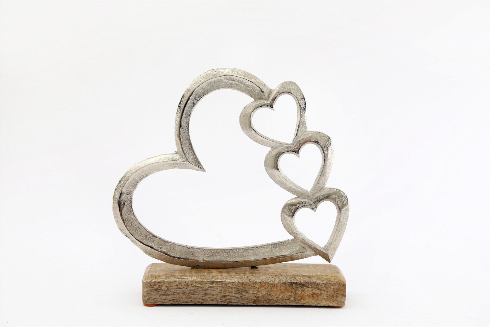 Metal Silver Four Heart Ornament On A Wooden Base Medium