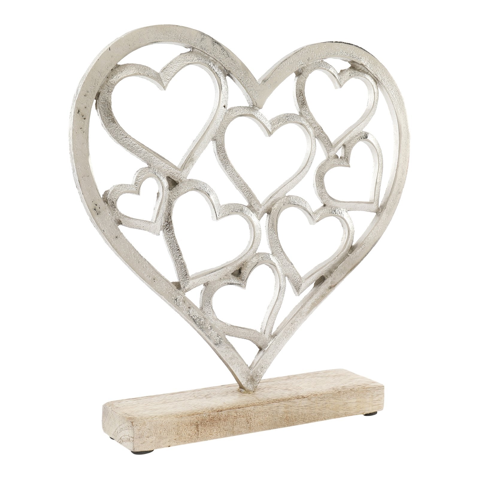 This Silver Metal hearts within one heart ornament set on a wooden plinth would be sit beautifully in any home. The silver colour gives a soft contrast to any backdrop while still bringing attention to the display. A silver metal heart with internal smaller hearts on a wooden plinth measuring 20x6x2.5cm. Overall measurements are: D6 x H27 x W27cm SKU: OR1709
