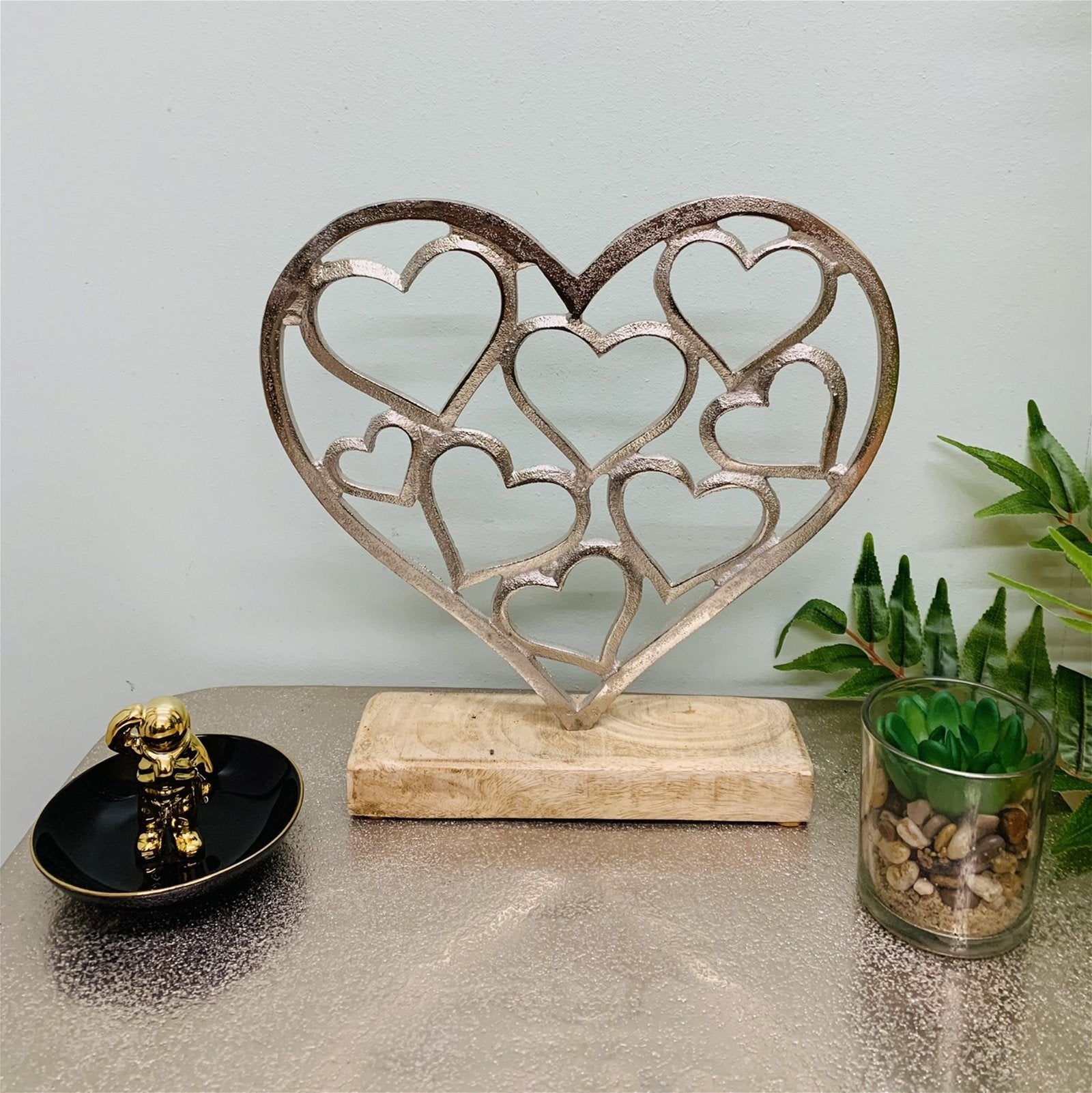 This Silver Metal hearts within one heart ornament set on a wooden plinth would be sit beautifully in any home. The silver colour gives a soft contrast to any backdrop while still bringing attention to the display. A silver metal heart with internal smaller hearts on a wooden plinth measuring 18x5x2.5cm. Overall measurements are: D5 x H23 x W22cm SKU: OR1710