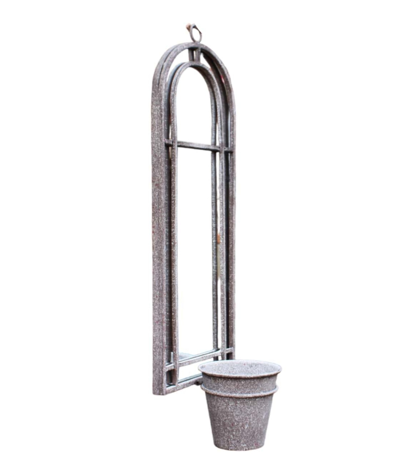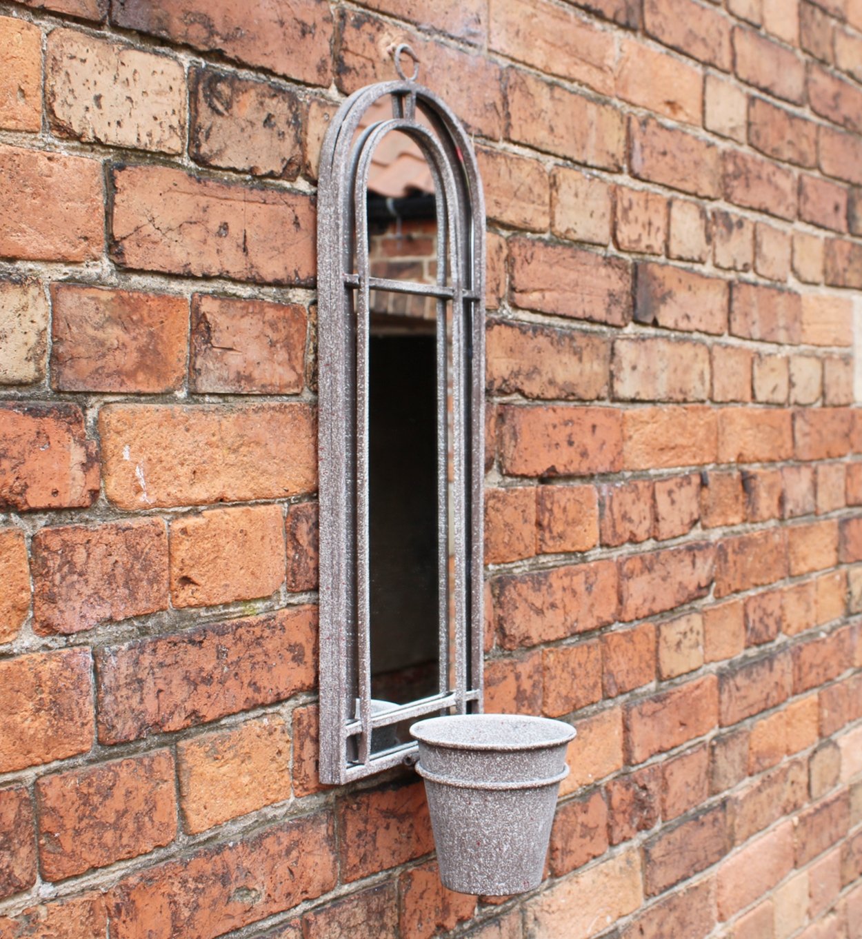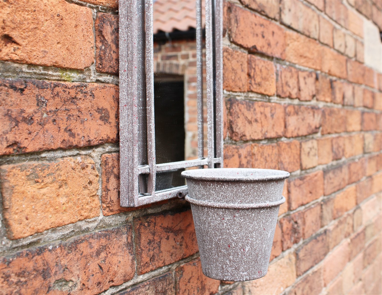 Metal painted rusty effect garden mirror with pot holder and metal plant pot. Makes a great focal point for your garden or patio. Measurements: D15 x H56 x W21cm