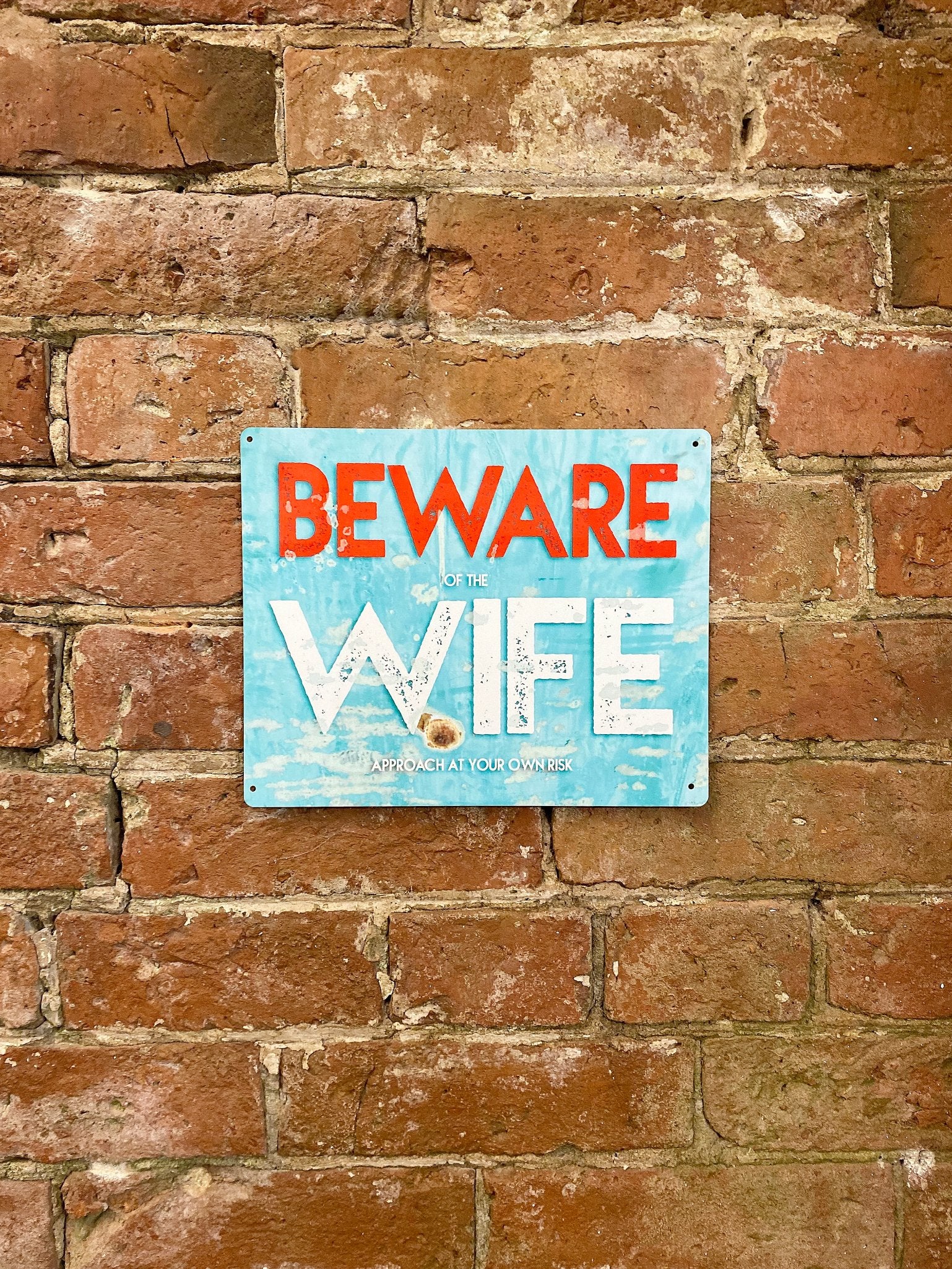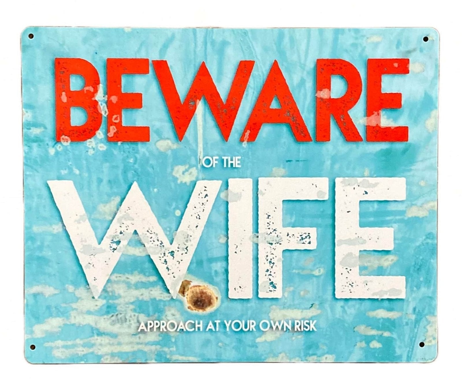 Part of our fantastic range of reproduction vintage metal signs. Beware Of The Wife sign. Made in the UK from aluminium, suitable for use inside or outside. Every poster features 4 drill holes for ease of fixing to the wall. Measurements: D0.1 x H25 x W20cm