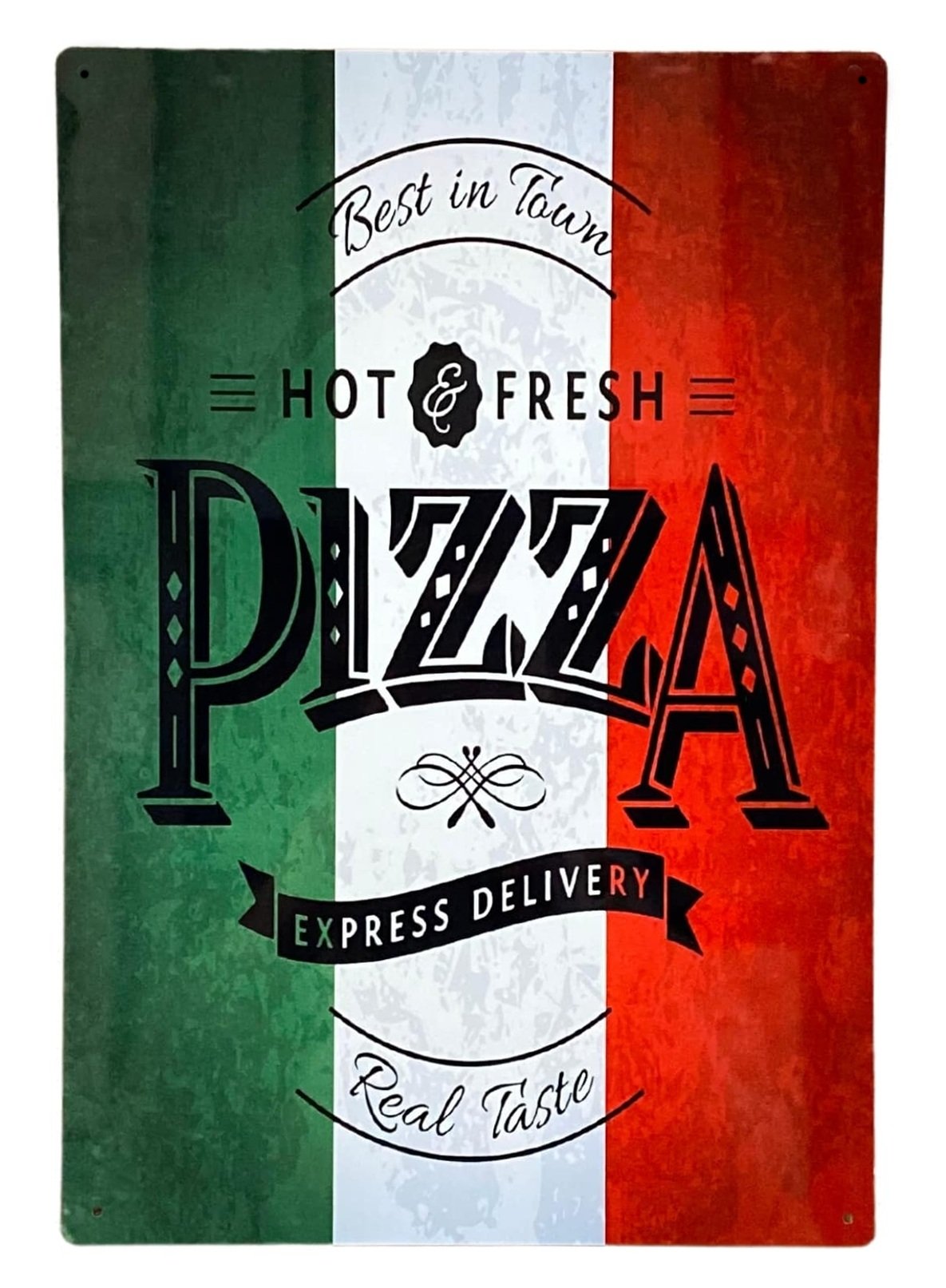 Part of our fantastic range of reproduction vintage metal signs. Pizza Italy sign. Made in the UK from aluminium, suitable for use inside or outside. Every poster features 4 drill holes for ease of fixing to the wall. Measurements: D0.1 x H41 x W28cm