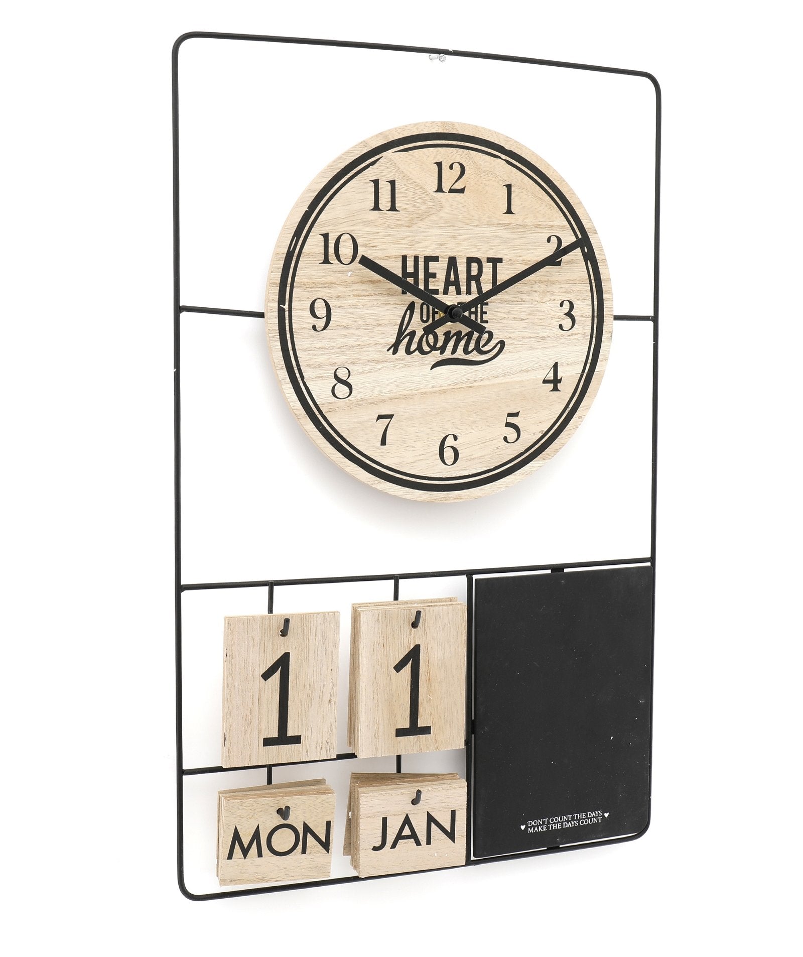 This modern wooden clock with wooden date plaques and black memo board would be a useful addition to any office or home. The clock face and numbers are on a black metal frame giving a simplistic feel to the piece. The clock face size is 24cm. The date plaques are 7x9cm and 0.5 cm deep. Overall measurements are: D5 x H52 x W33cm SKU: KG0959