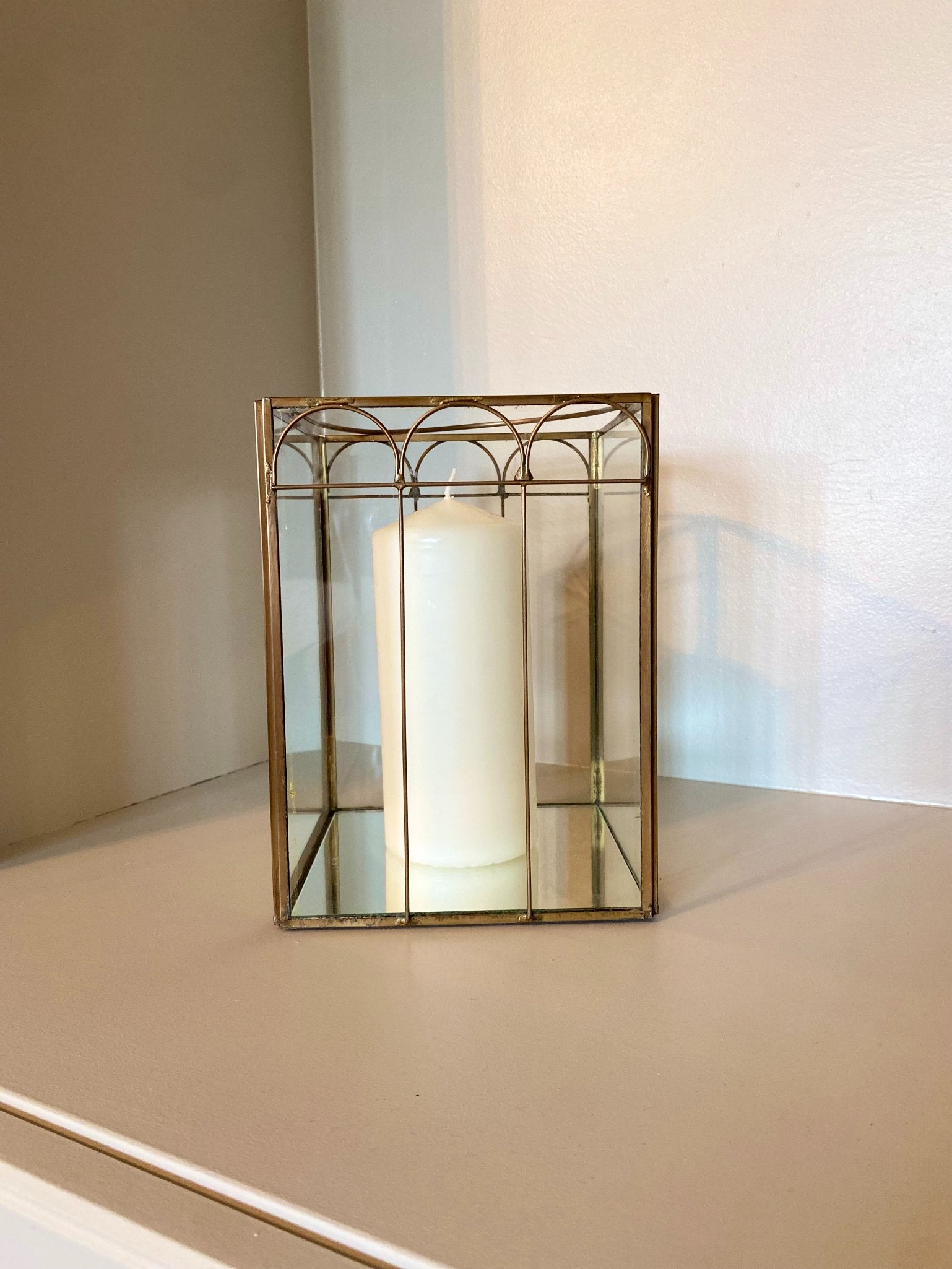 Beautiful table-top or mantelpiece decor, with multiple glass panels sitting between iron frames, in antique gold finish. Square in shape, with mirrored base and carry handle. Designed to be suitable for use both indoors and outdoors, they make a stunning statement paired in their different sizes. Measurements: D14 x H20 x W14cm