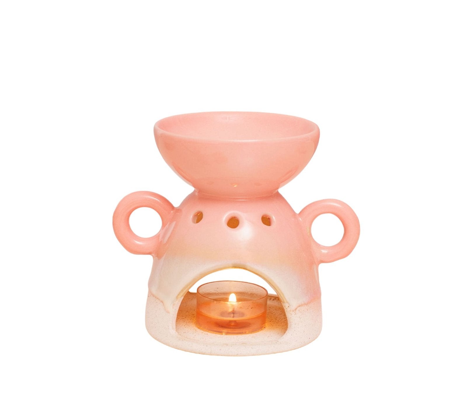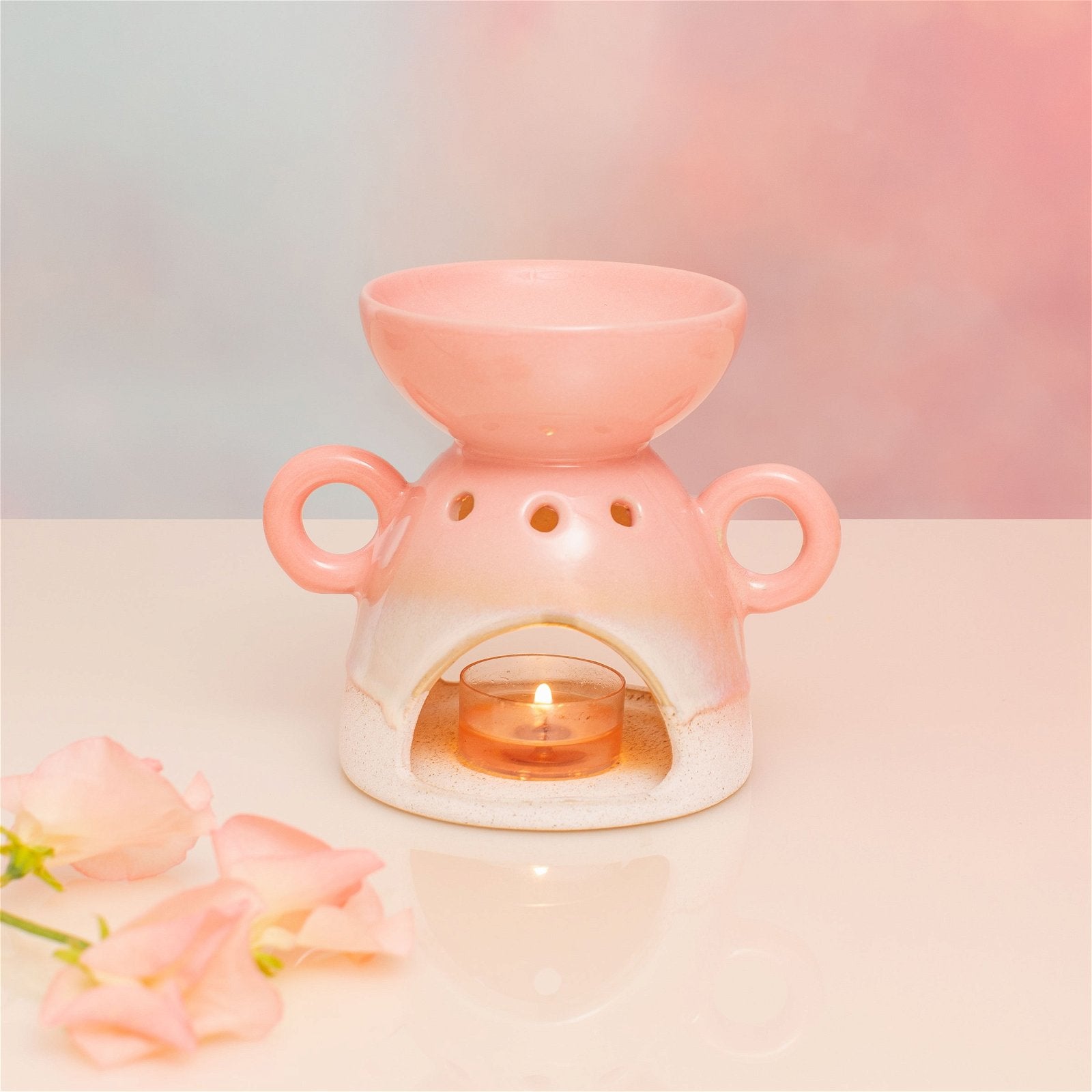 This home fragrance accessory can be used to with essential oils or wax melts. You'll find a deep dish on top to hold the essential oil of your choice. Pop a tealight into the chamber below to infuse a room with beautiful fragrance. Designed with a gloss pink finish, created from stoneware and finished using a reactive glaze technique which forms subtle variations in colour tones, making each one beautifully unique. Measurements: D10 x H12.5 x W11.5cm