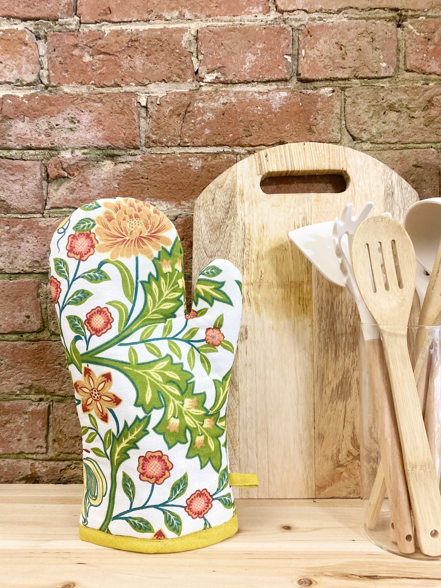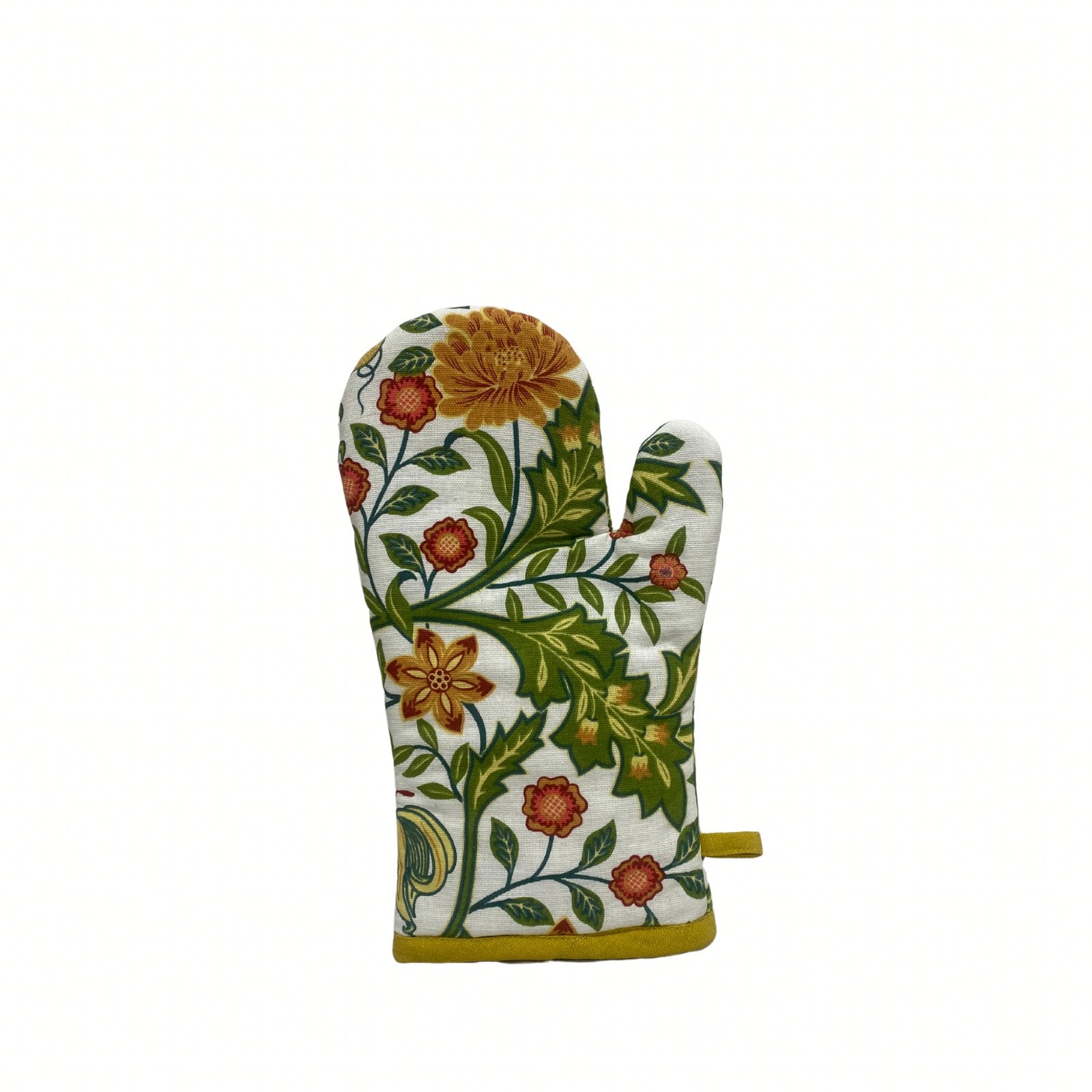 A single oven glove in the Sussex botanical print with mustard coloured binding. A single well padded oven glove with loop for easy storage. Measurements: D2 x H32 x W15cm